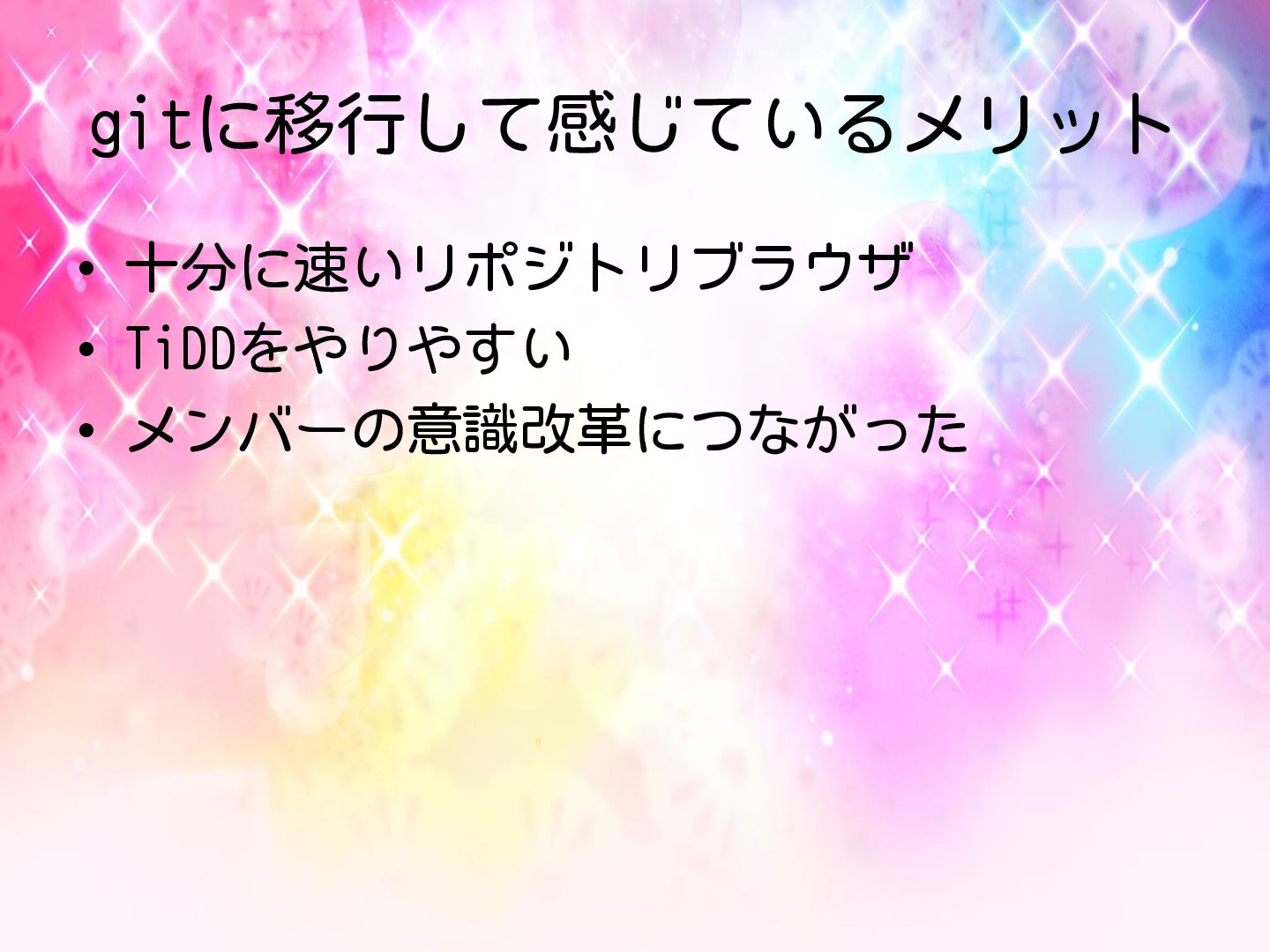 gitに移行して感じているメリット • 十分に速いリポジトリブラウザ • TiDDをやりやすい • メンバーの意識改革につながった