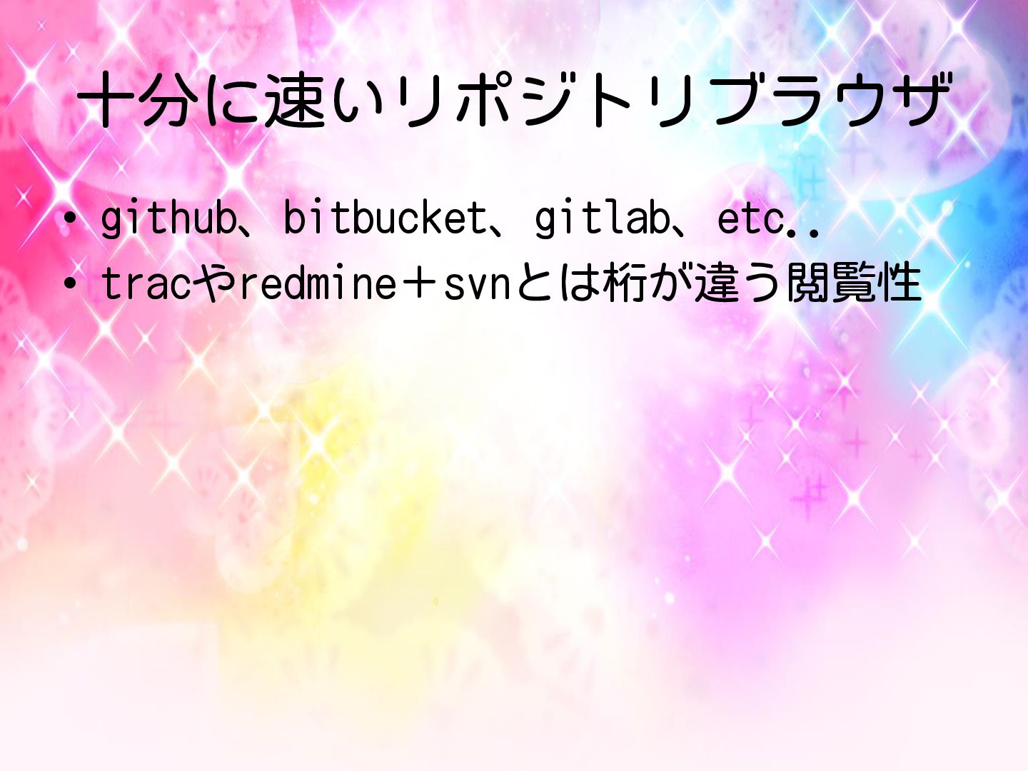 十分に速いリポジトリブラウザ • github、bitbucket、gitlab、etc.. • tracやredmine+svnとは桁が違う閲覧性
