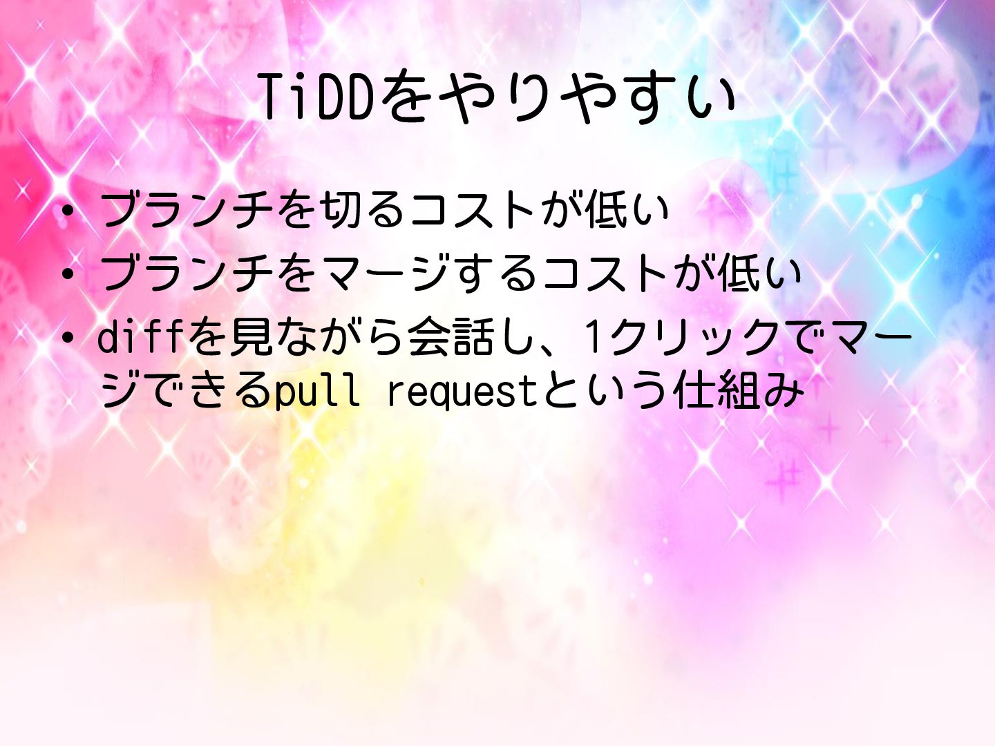 TiDDをやりやすい • ブランチを切るコストが低い • ブランチをマージするコストが低い • diffを見ながら会話し、1クリックでマー ジできるpull requestという仕組み