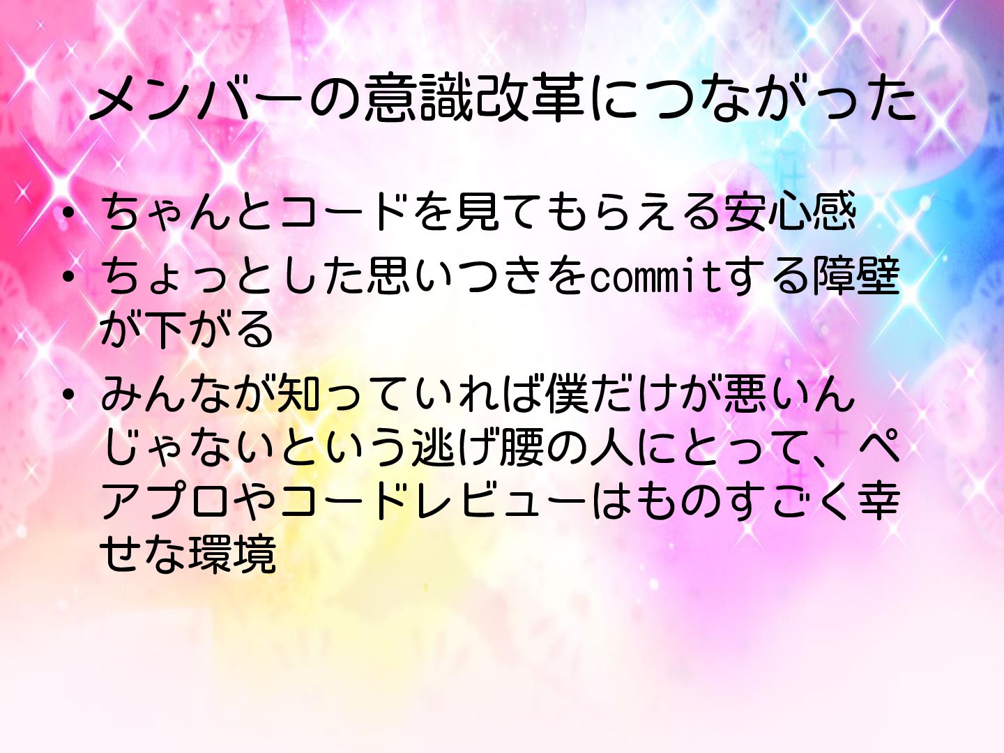 メンバーの意識改革につながった • ちゃんとコードを見てもらえる安心感 • ちょっとした思いつきをcommitする障壁 が下がる • みんなが知っていれば僕だけが悪いん じゃないという逃げ腰の人にとって、ペ アプロやコードレビューはものすごく幸