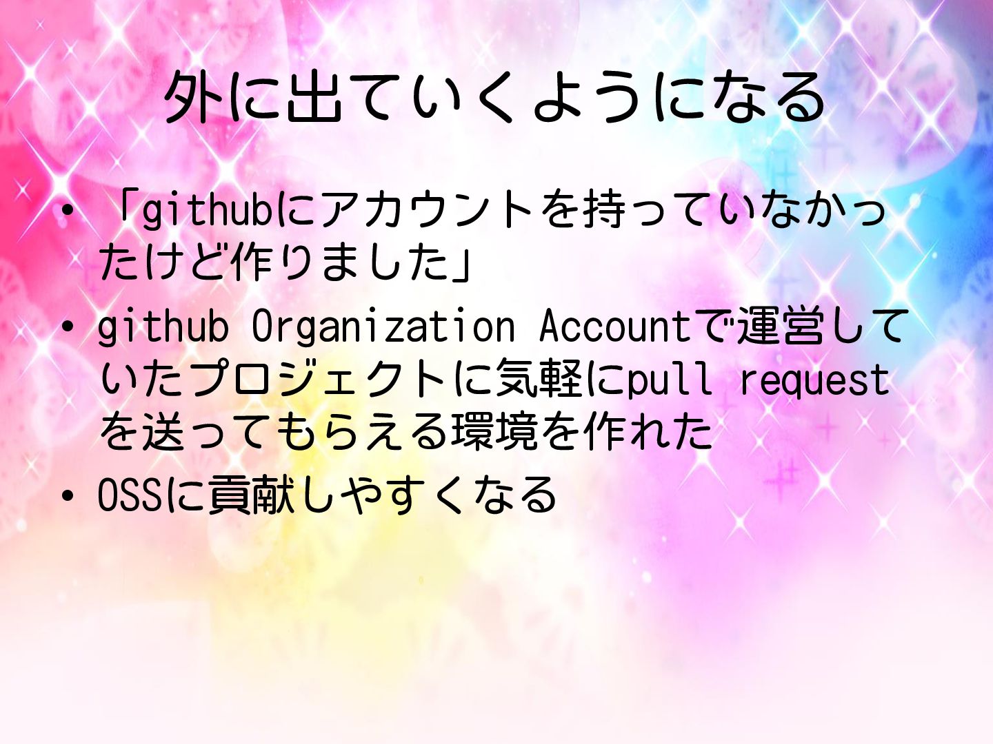 外に出ていくようになる • 「githubにアカウントを持っていなかっ たけど作りました」 • github Organization Accountで運営して いたプロジェクトに気軽にpull request