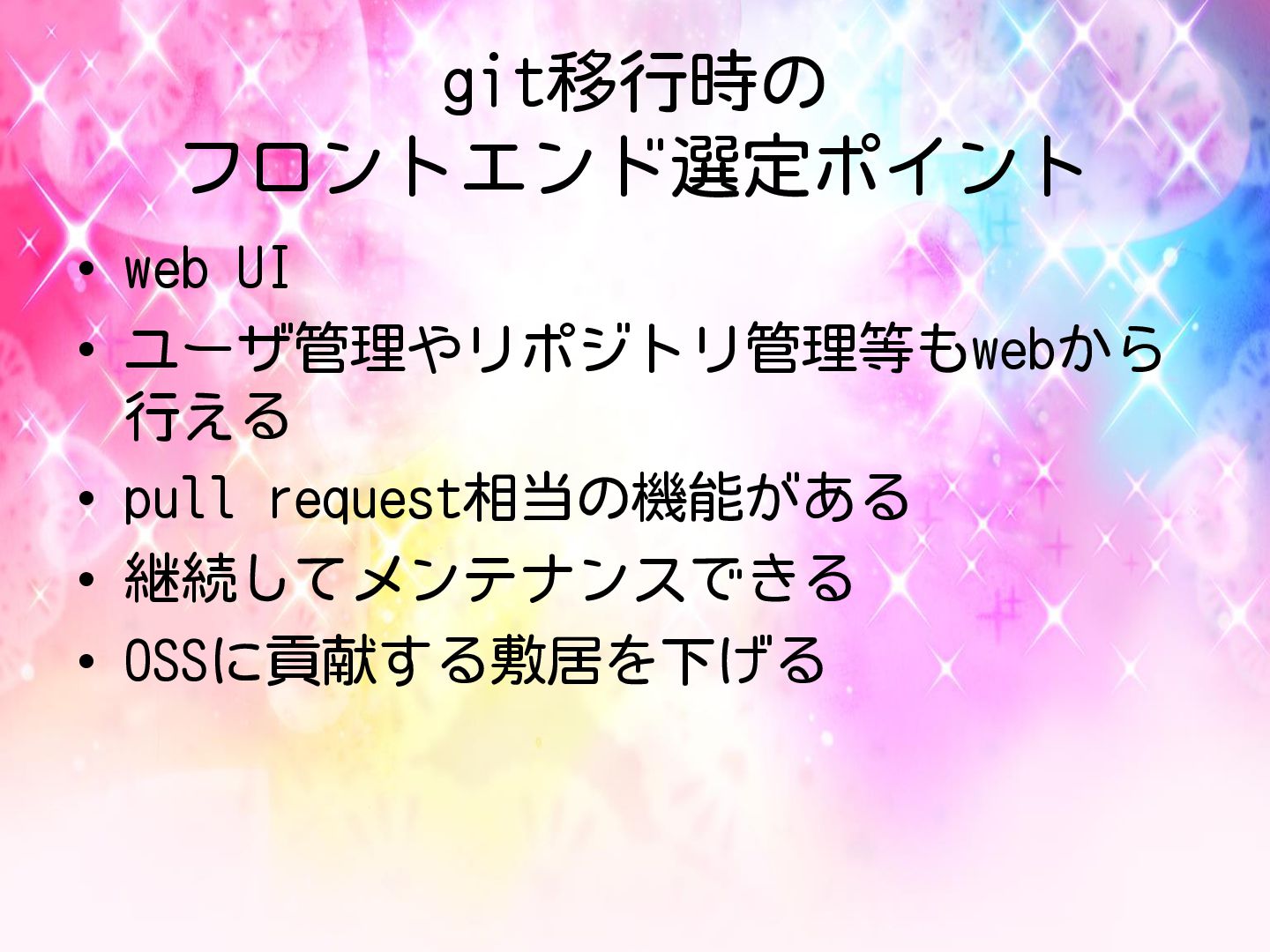 git移行時の フロントエンド選定ポイント • web UI • ユーザ管理やリポジトリ管理等もwebから 行える • pull