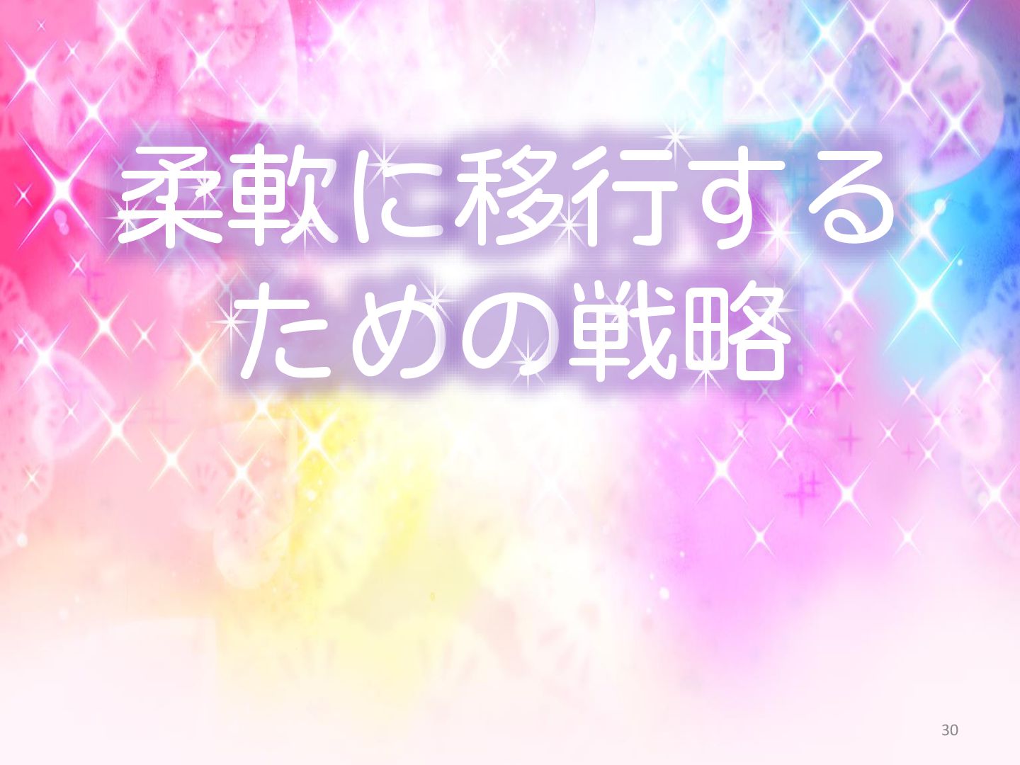 • 移行してないプロジェクトは仲間外れだ よね、カッコ悪いよねという空気の醸成 – 「開発者はうまく怒らせるとすごい生産性を 発揮する」