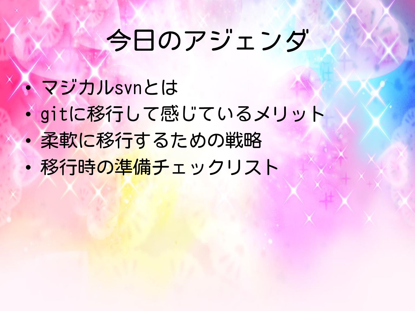 今日のアジェンダ • マジカルsvnとは • gitに移行して感じているメリット • 柔軟に移行するための戦略 • 移行時の準備チェックリスト