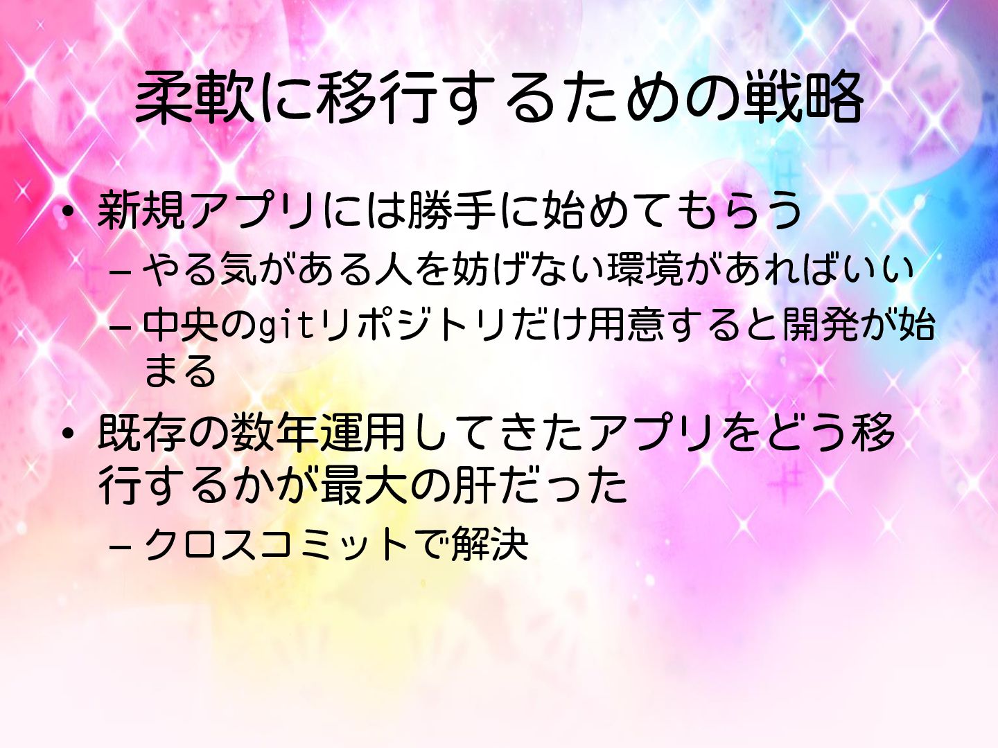 柔軟に移行するための戦略 • 新規アプリには勝手に始めてもらう – やる気がある人を妨げない環境があればいい – 中央のgitリポジトリだけ用意すると開発が始 まる • 既存の数年運用してきたアプリをどう移