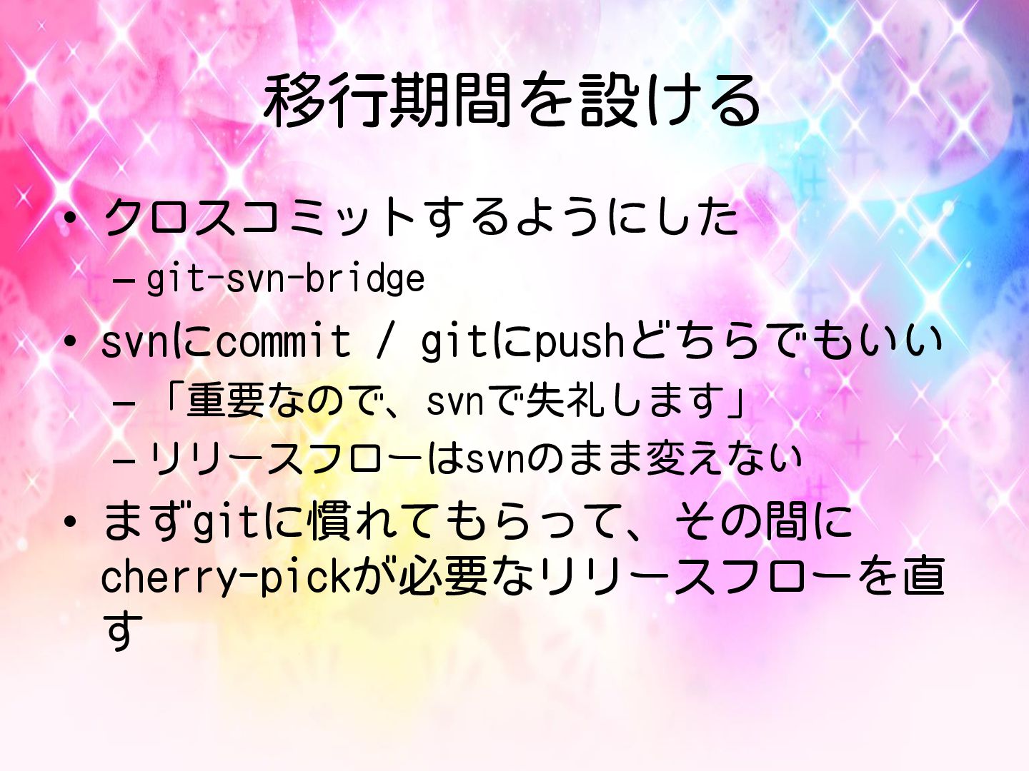移行期間を設ける • クロスコミットするようにした – git-svn-bridge • svnにcommit / gitにpushどちらでもいい –