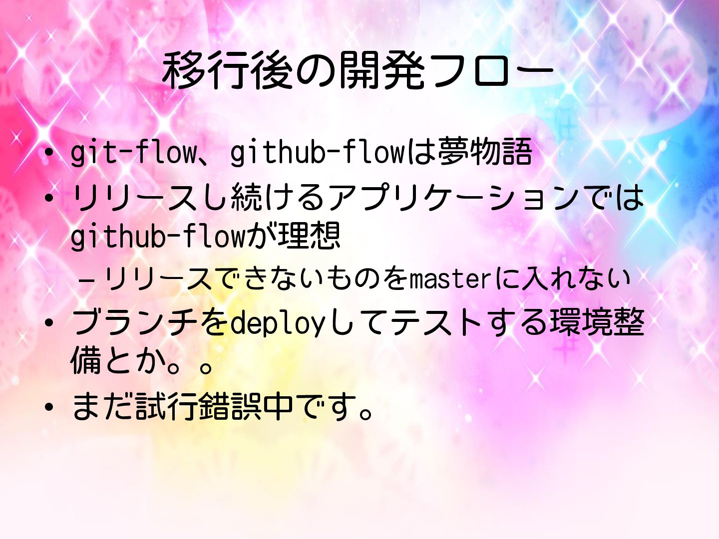 移行後の開発フロー • git-flow、github-flowは夢物語 • リリースし続けるアプリケーションでは github-flowが理想 – リリースできないものをmasterに入れない • ブランチをdeployしてテストする環境整