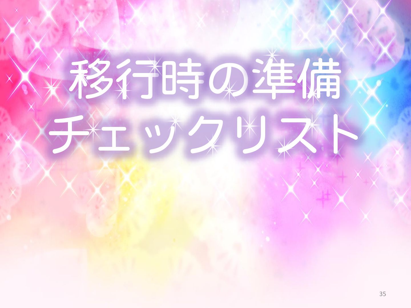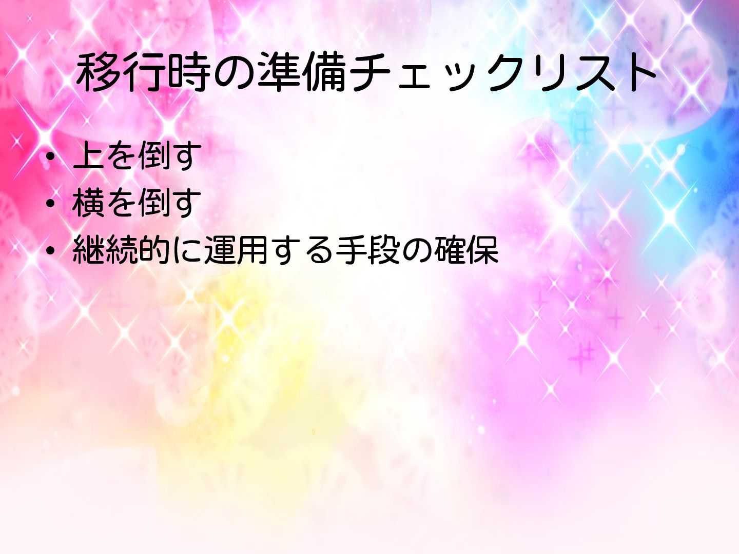 移行時の準備チェックリスト • 上を倒す • 横を倒す • 継続的に運用する手段の確保