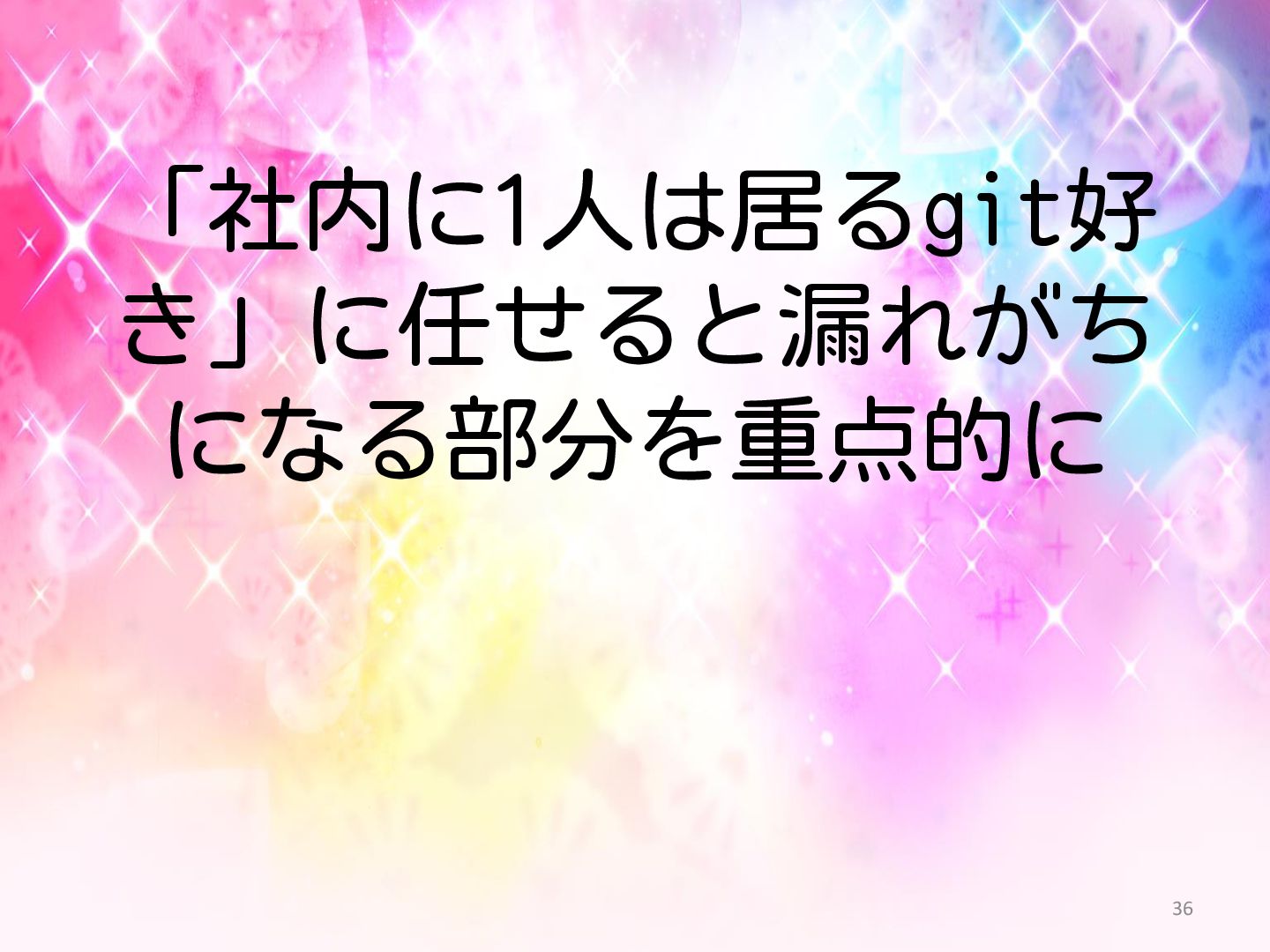 「社内に1人は居るgit好 き」に任せると漏れがち になる部分を重点的に 36