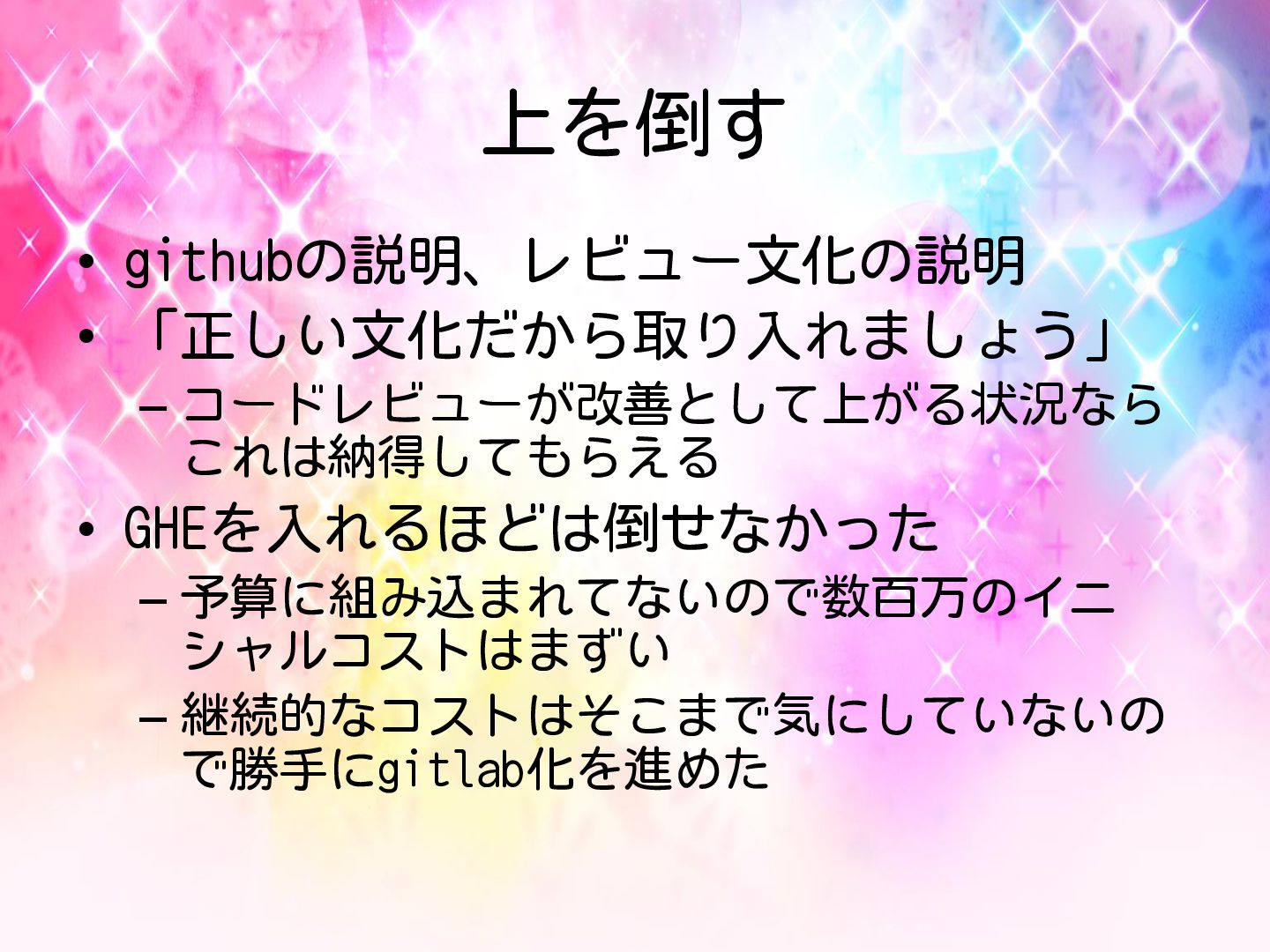 上を倒す • githubの説明、レビュー文化の説明 • 「正しい文化だから取り入れましょう」 – コードレビューが改善として上がる状況なら これは納得してもらえる • GHEを入れるほどは倒せなかった