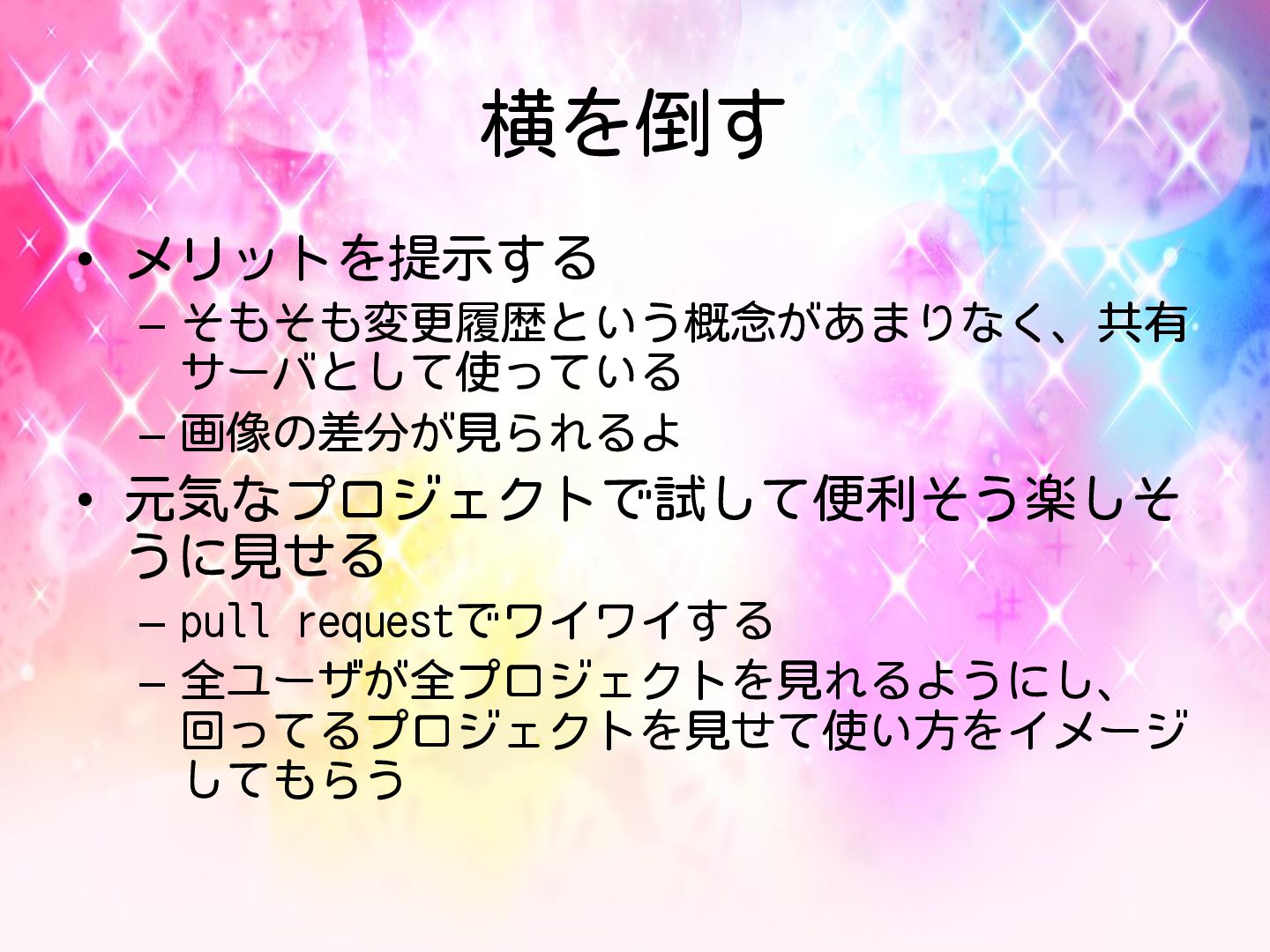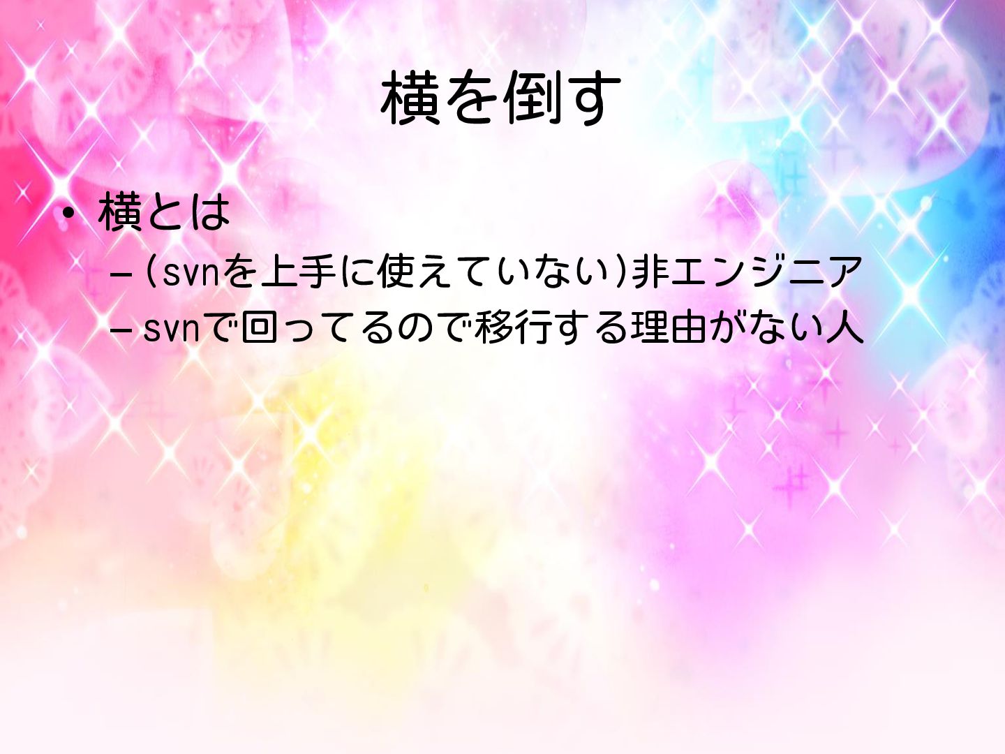 横を倒す • 横とは – (svnを上手に使えていない)非エンジニア – svnで回ってるので移行する理由がない人