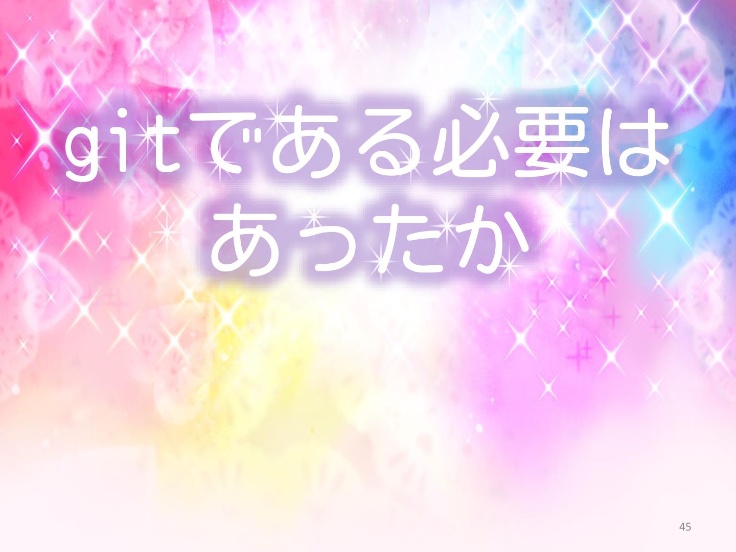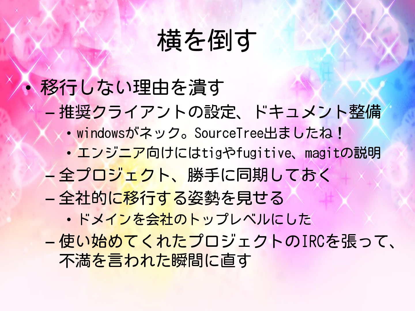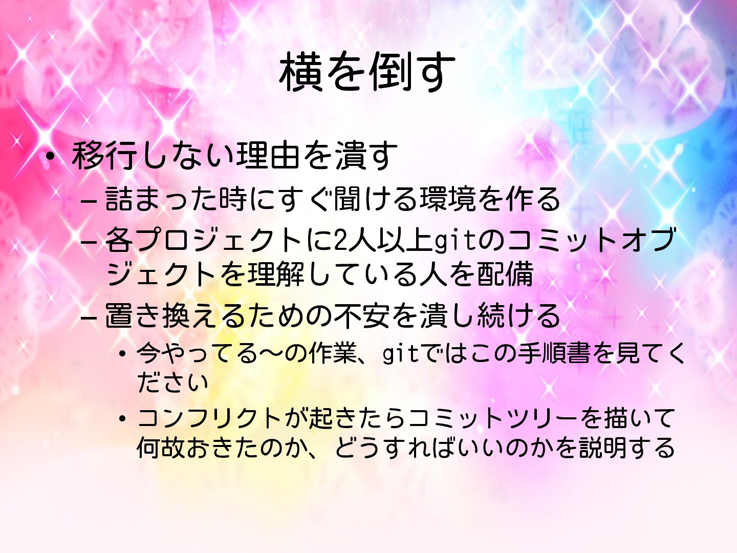 横を倒す • 移行しない理由を潰す – 詰まった時にすぐ聞ける環境を作る – 各プロジェクトに2人以上gitのコミットオブ ジェクトを理解している人を配備 – 置き換えるための不安を潰し続ける