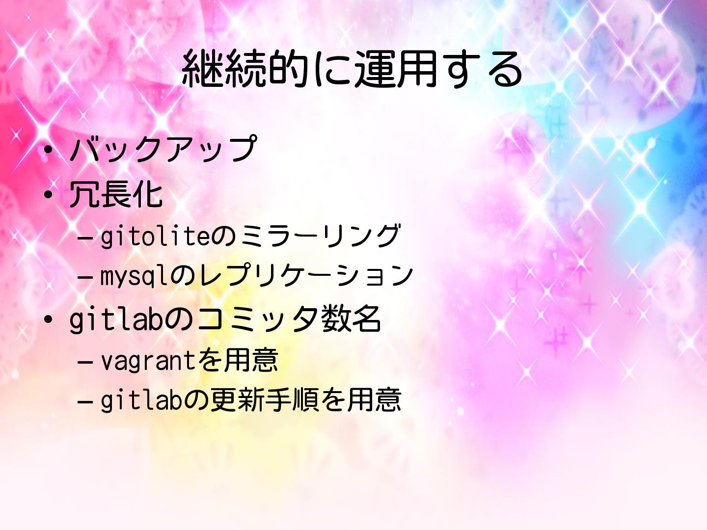 継続的に運用する • バックアップ • 冗長化 – gitoliteのミラーリング – mysqlのレプリケーション •