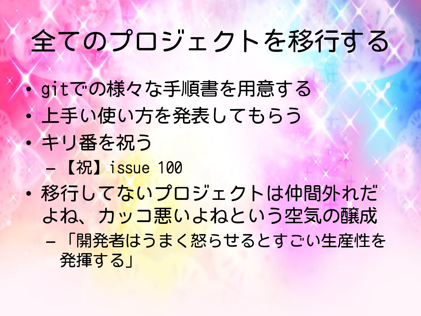 全てのプロジェクトを移行する • gitでの様々な手順書を用意する • 上手い使い方を発表してもらう • キリ番を祝う – 【祝】issue 100
