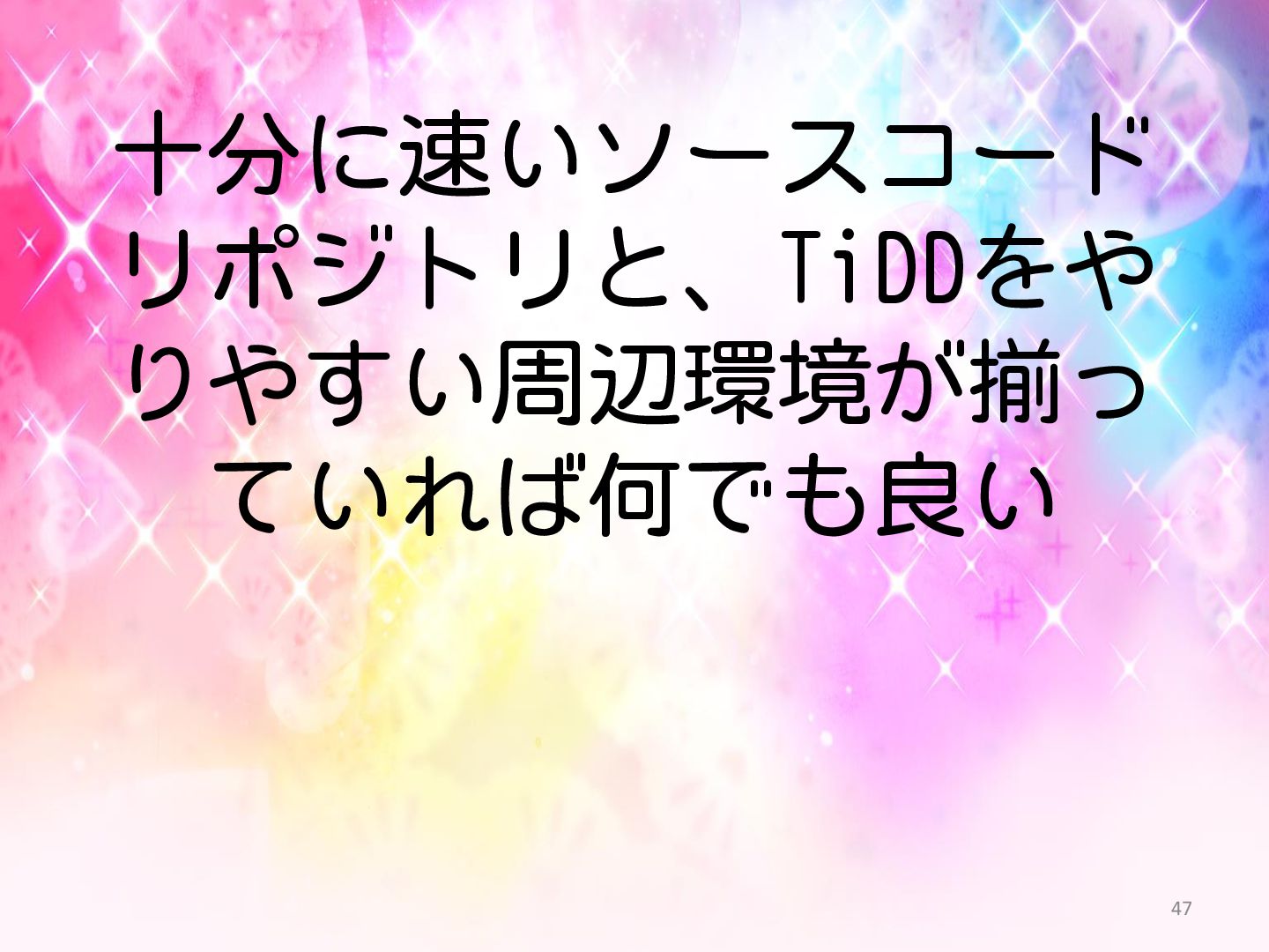 十分に速いソースコード リポジトリと、TiDDをや りやすい周辺環境が揃っ ていれば何でも良い 47