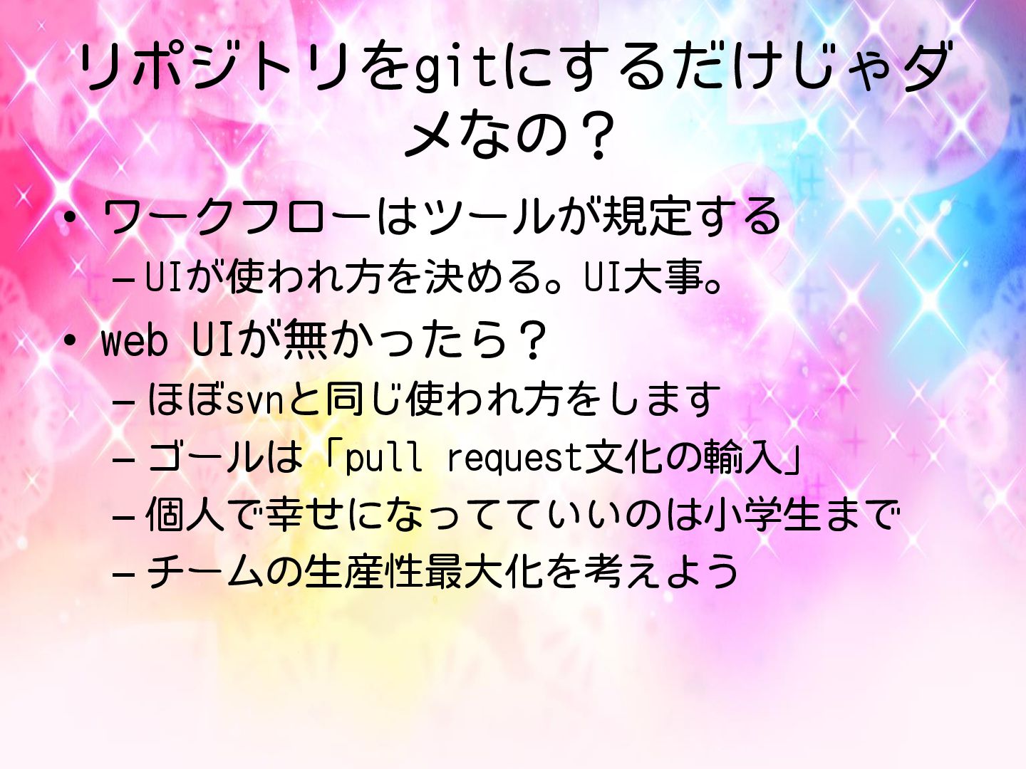 リポジトリをgitにするだけじゃダ メなの? • ワークフローはツールが規定する – UIが使われ方を決める。UI大事。 • web UIが無かったら? –