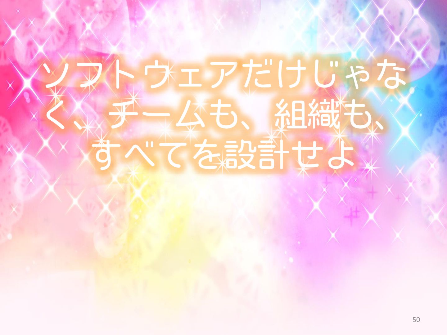 ソフトウェアだけじゃな く、チームも、組織も、 すべてを設計せよ 50