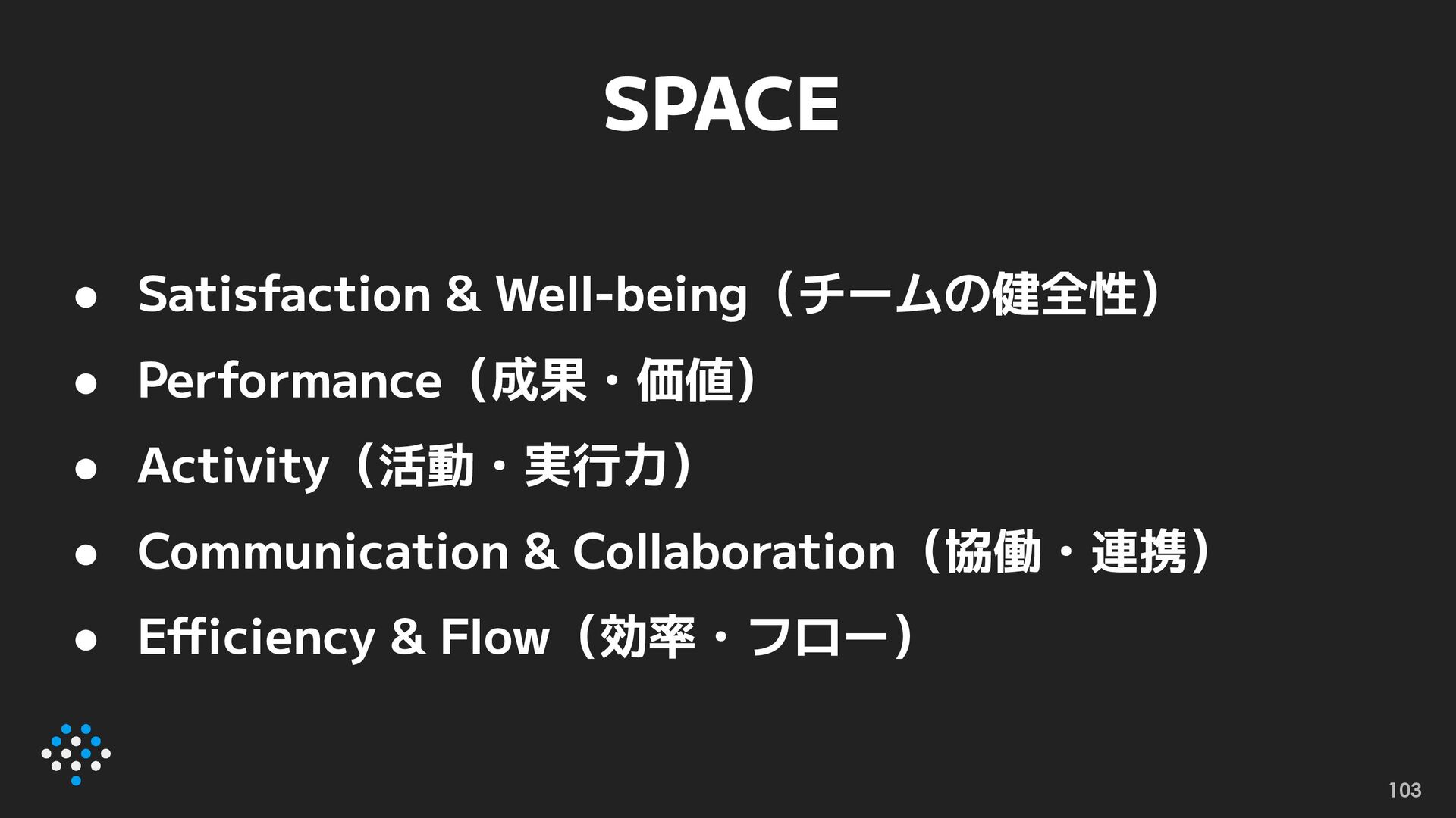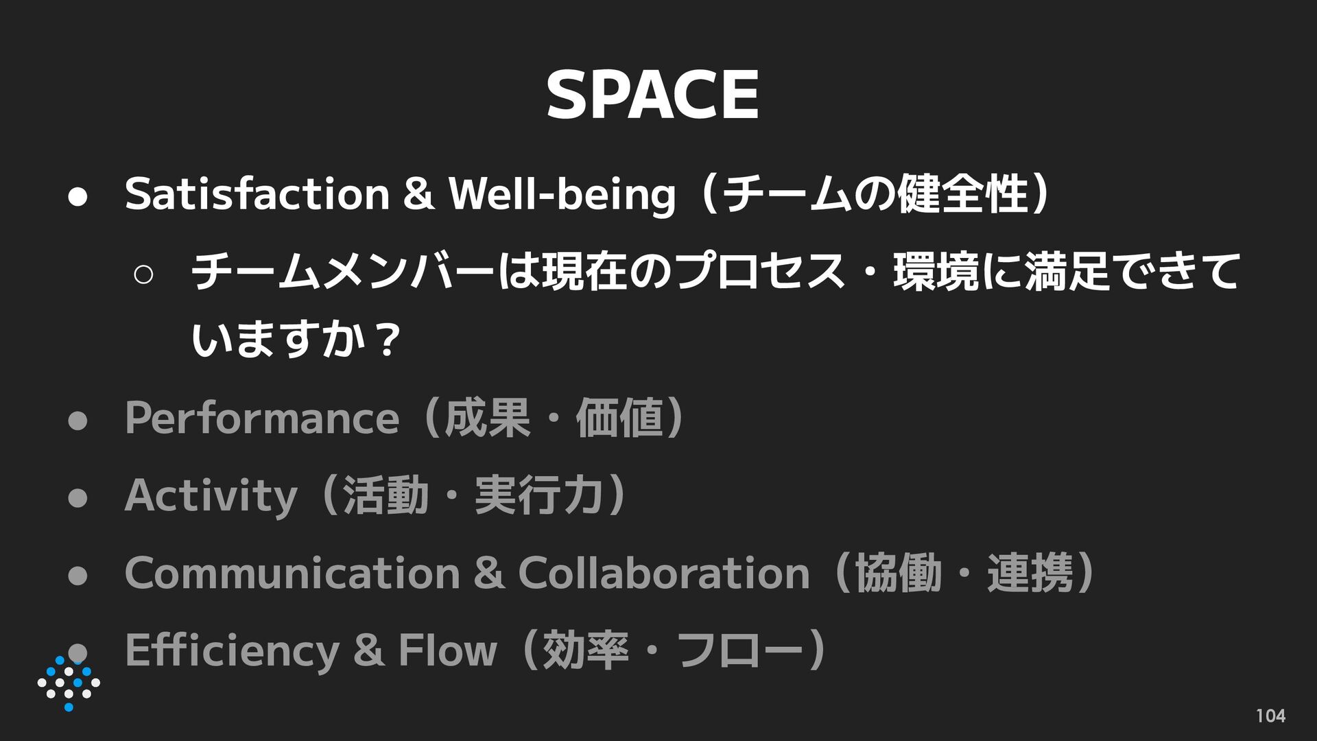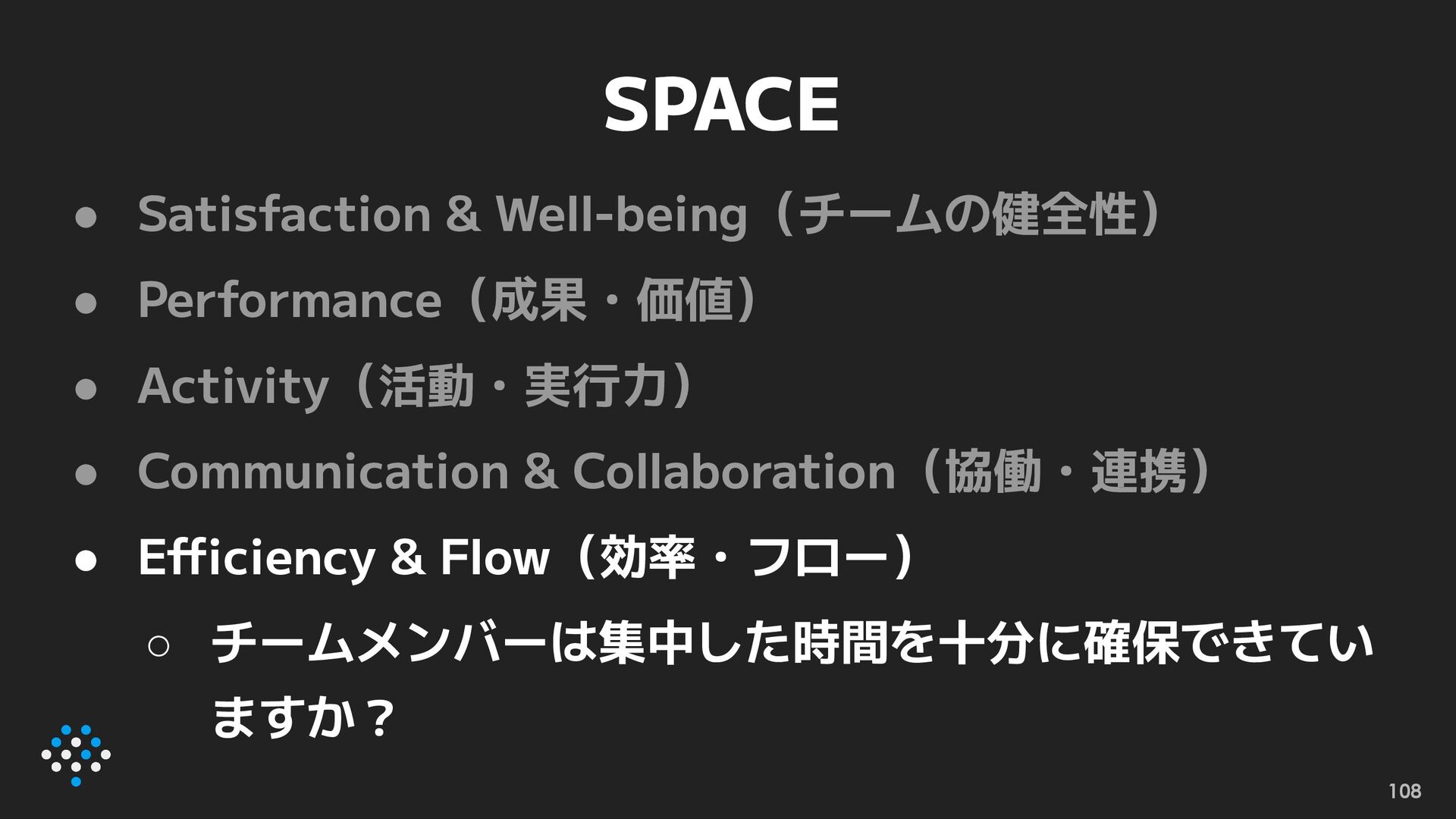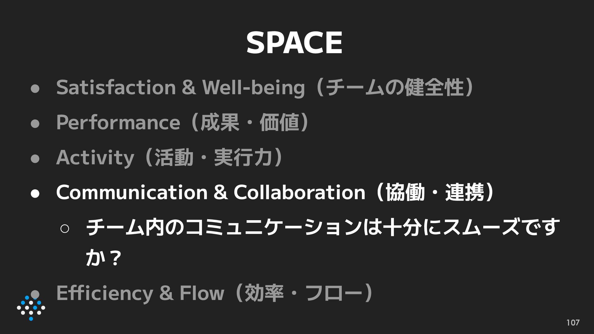 & Collaboration(協働・連携) ◦ チーム内のコミュニケーションは十分にスムーズです か? • Efficiency & Flow(効率・フロー) SPACE 107