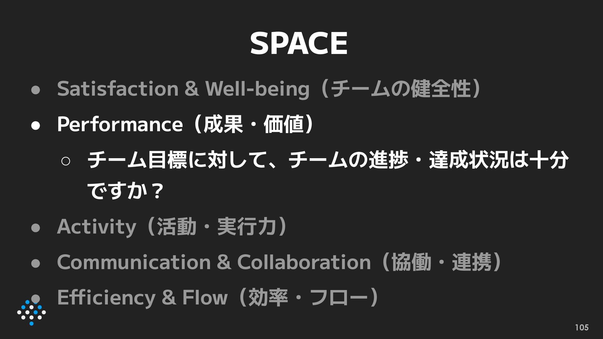 • Satisfaction & Well-being(チームの健全性) • Performance(成果・価値) • Activity(活動・実行力) • Communication