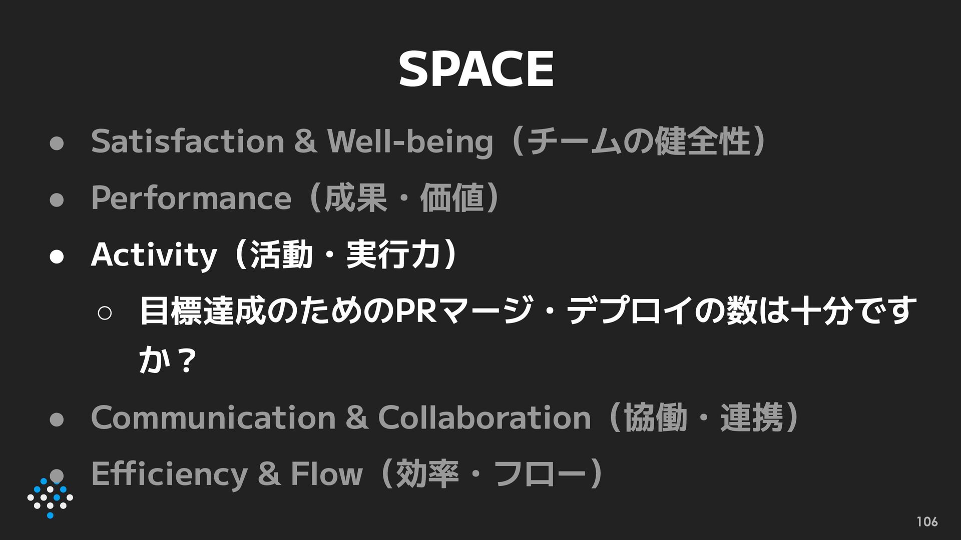 • Satisfaction & Well-being(チームの健全性) • Performance(成果・価値) • Activity(活動・実行力) ◦ 目標達成のためのPRマージ・デプロイの数は十分です