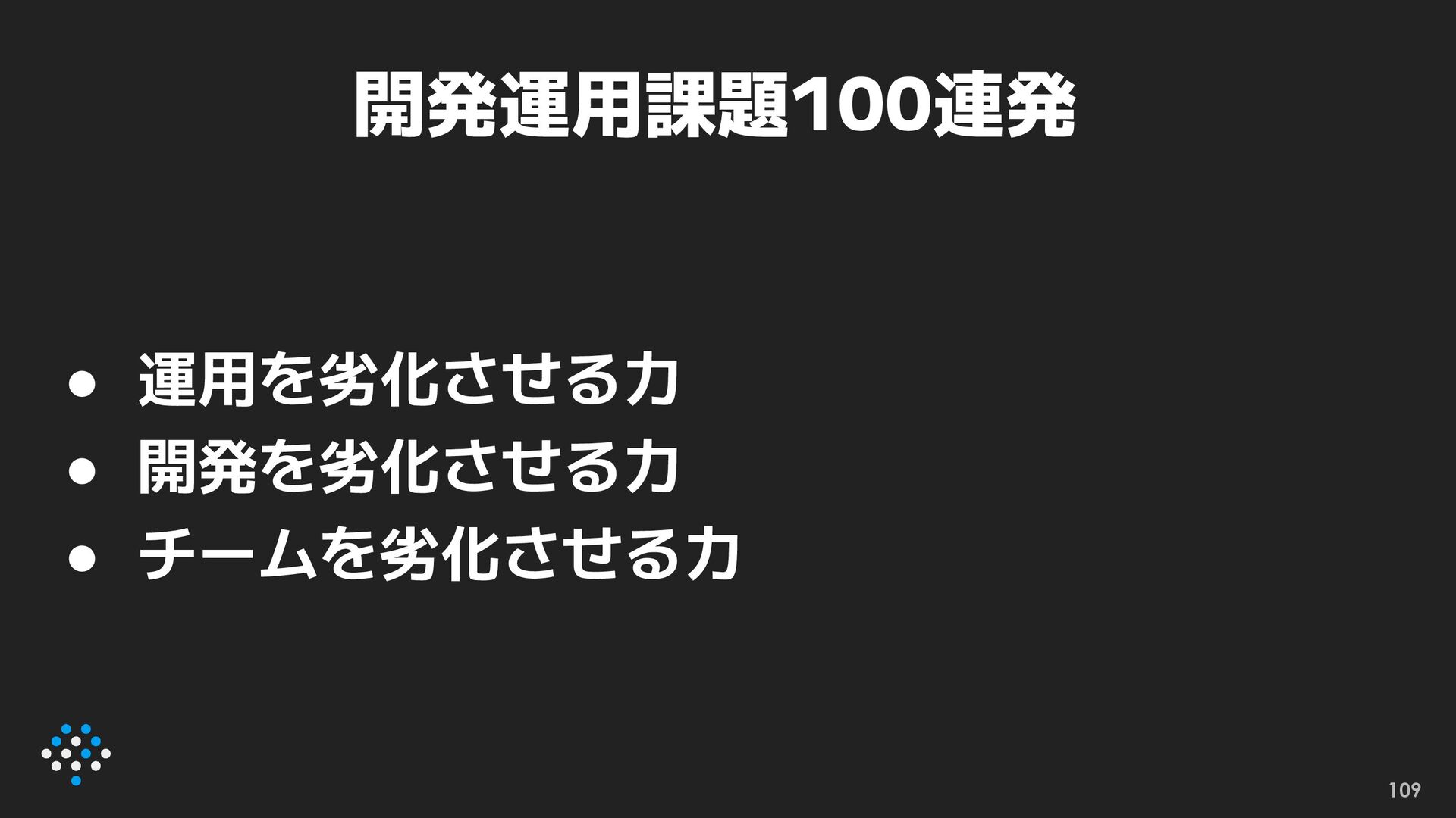 開発運用課題100連発 • 運用を劣化させる力 • 開発を劣化させる力 • チームを劣化させる力 109