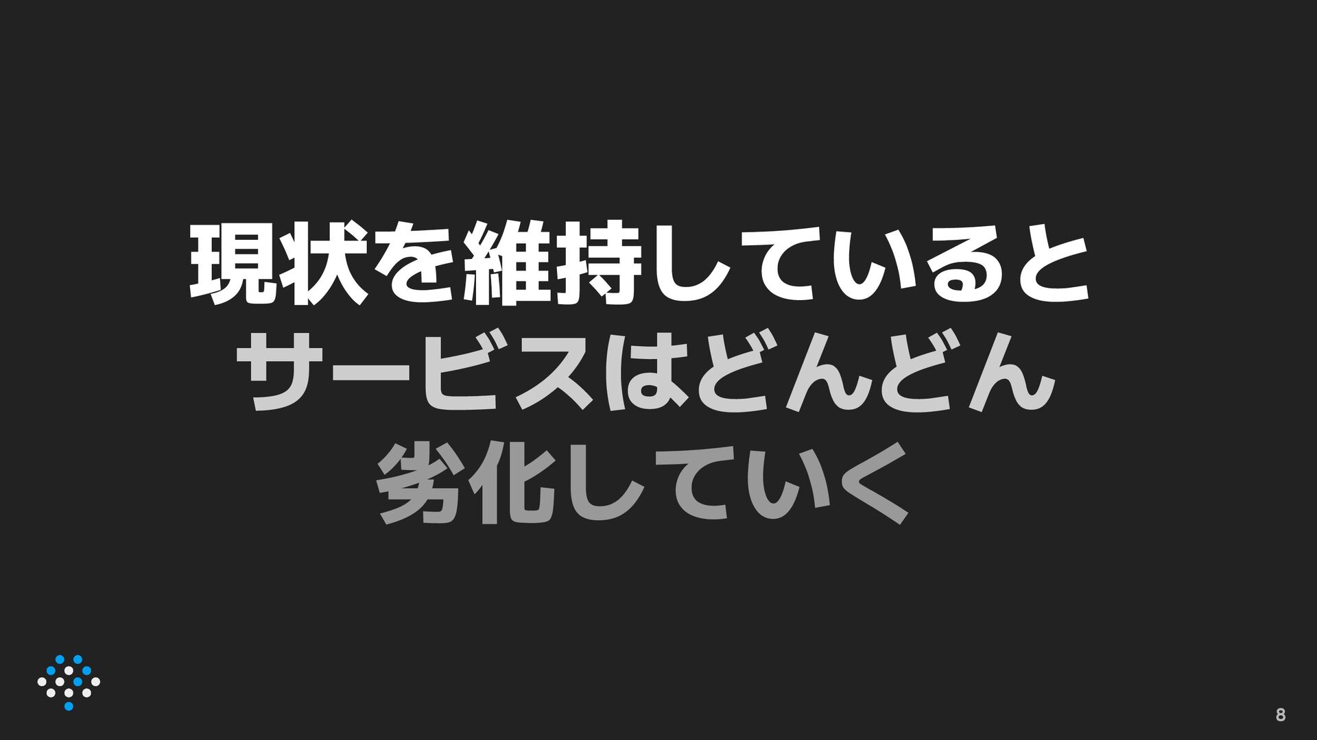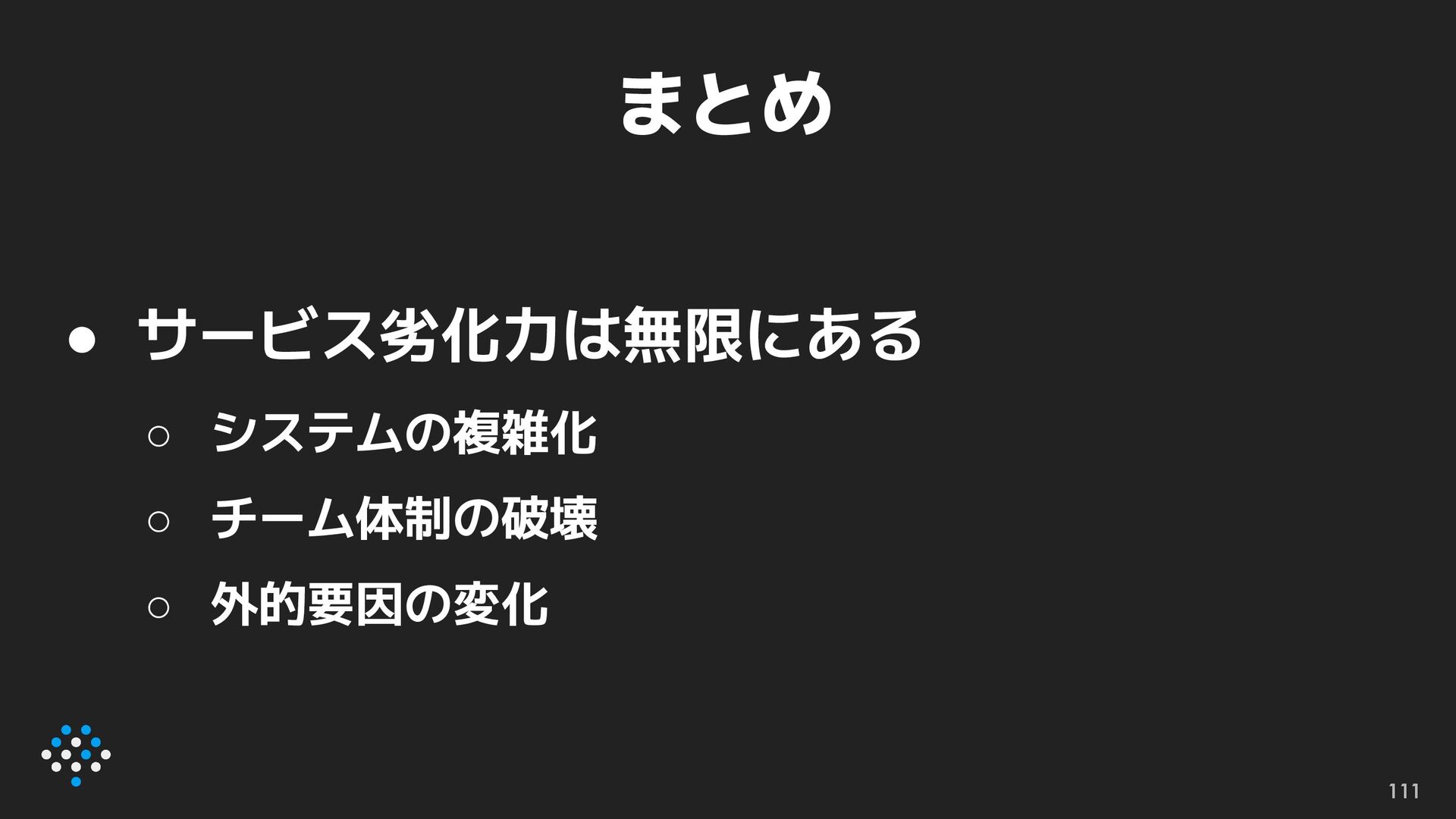 まとめ • サービス劣化力は無限にある ◦ システムの複雑化 ◦ チーム体制の破壊 ◦ 外的要因の変化 111