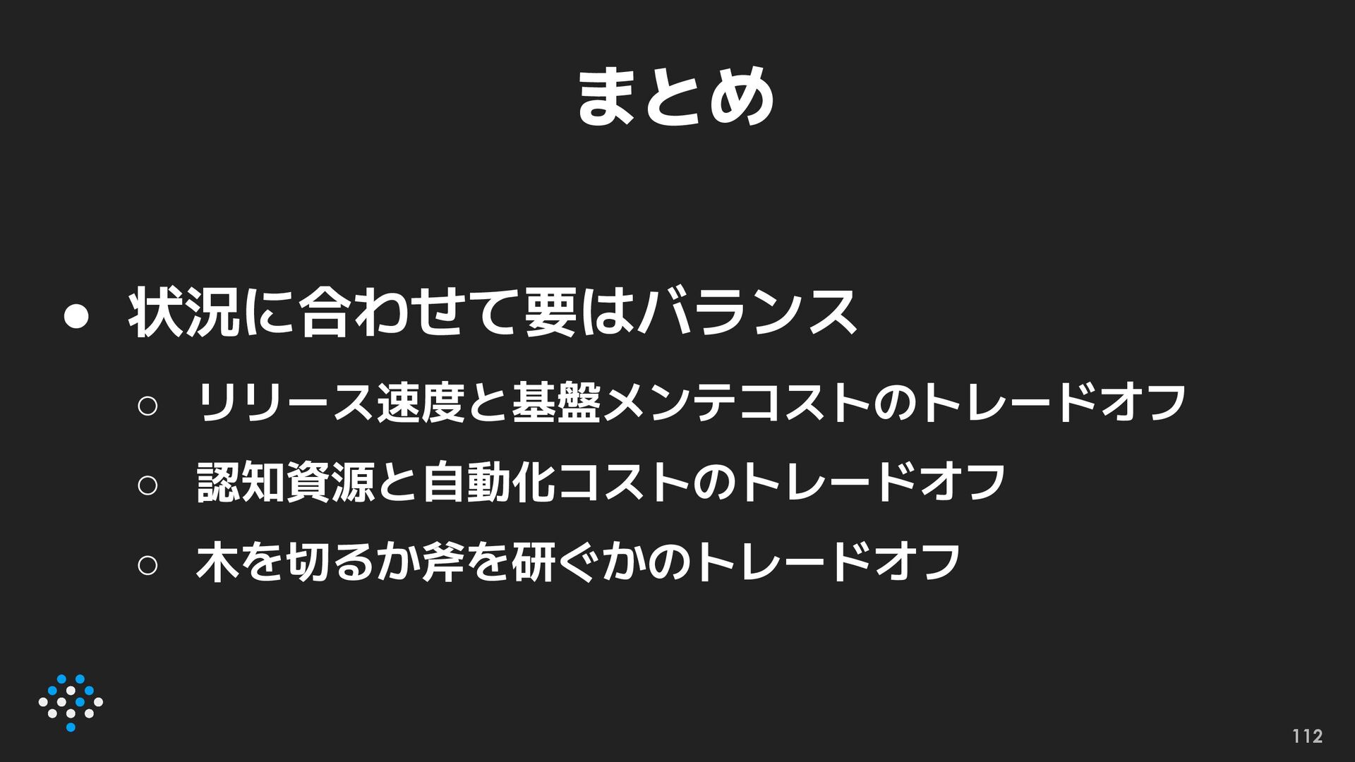 まとめ • 状況に合わせて要はバランス ◦ リリース速度と基盤メンテコストのトレードオフ ◦ 認知資源と自動化コストのトレードオフ ◦ 木を切るか斧を研ぐかのトレードオフ 112
