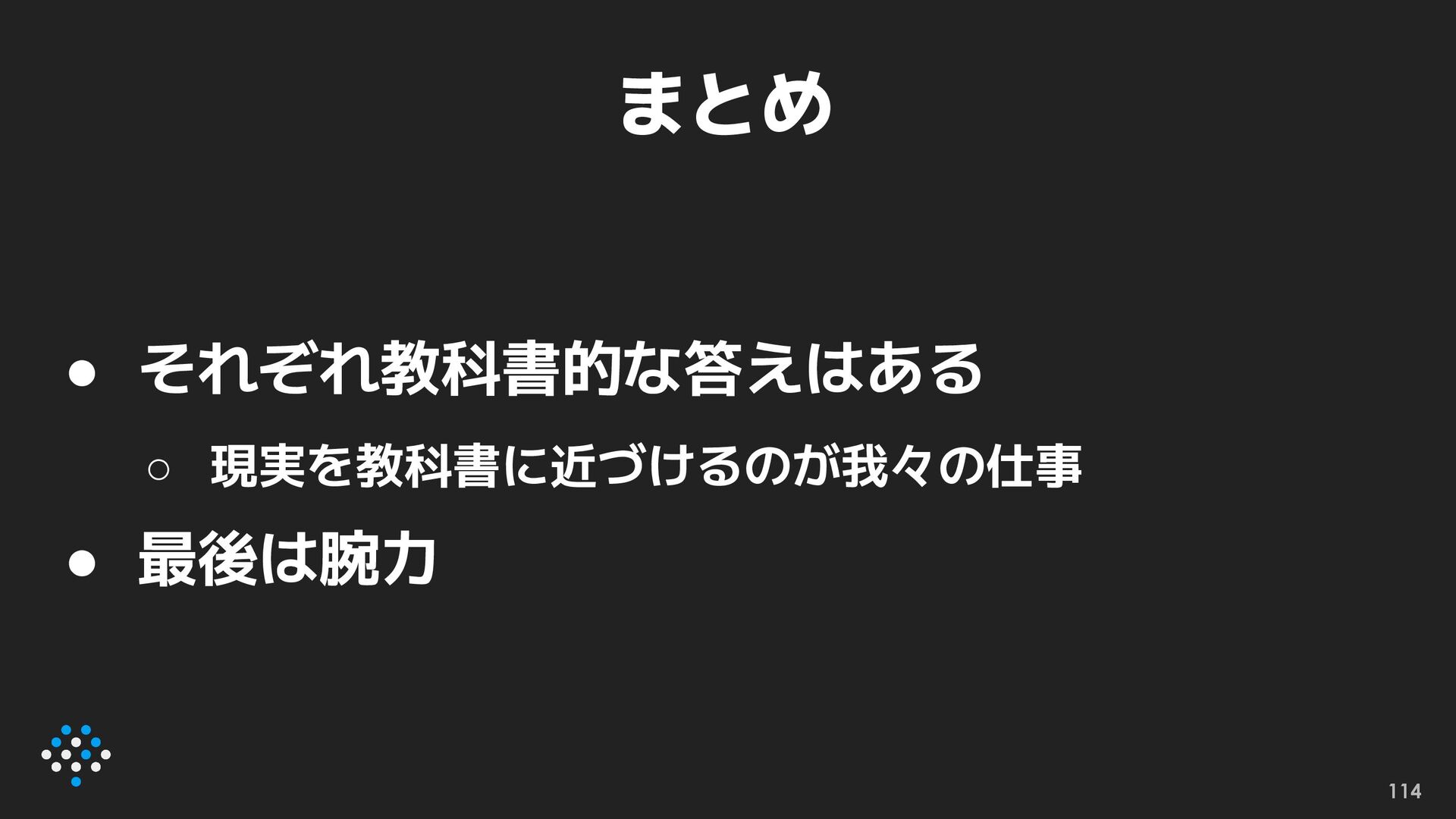 まとめ • それぞれ教科書的な答えはある ◦ 現実を教科書に近づけるのが我々の仕事 • 最後は腕力 114