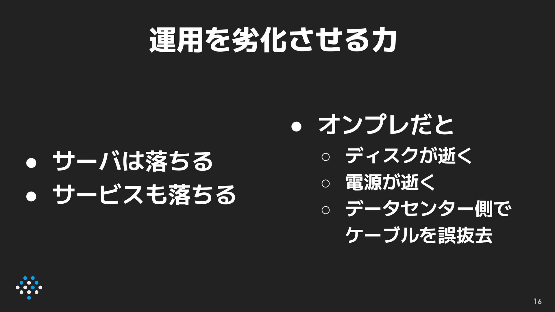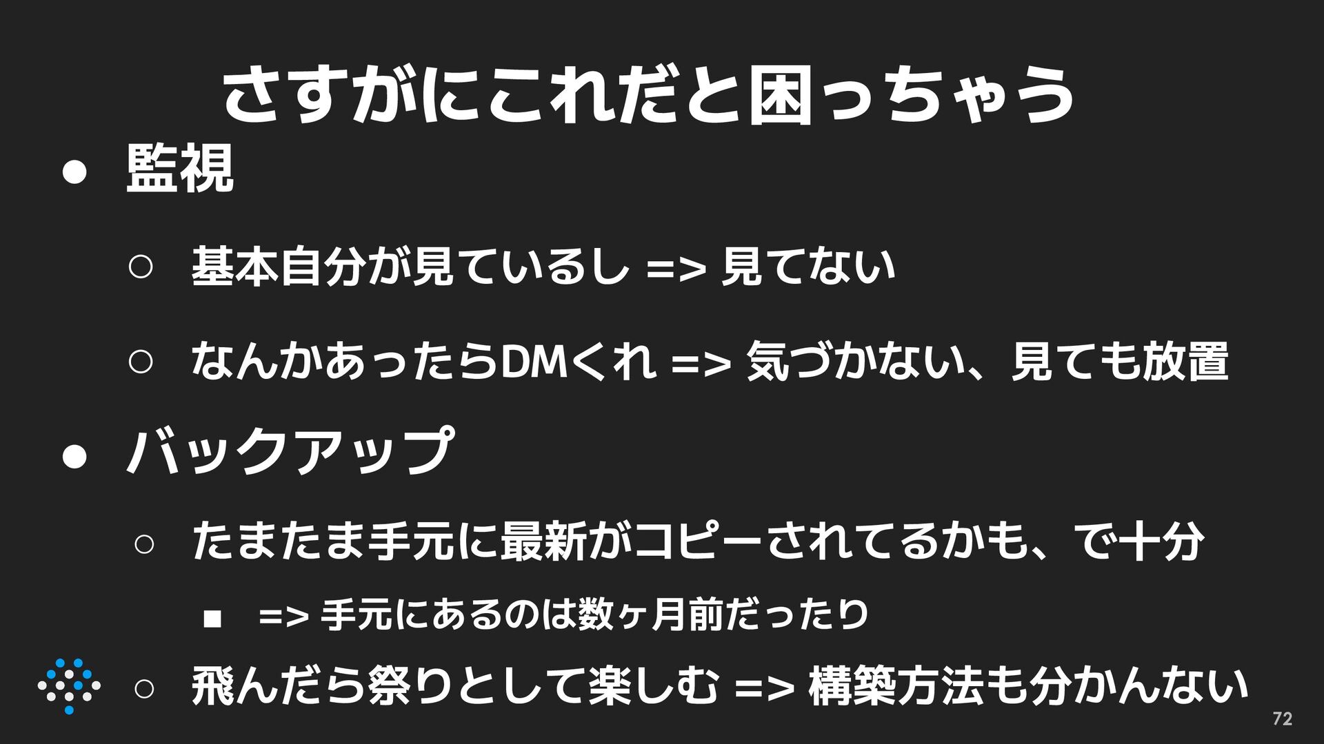 気づかない、見ても放置 • バックアップ ◦ たまたま手元に最新がコピーされてるかも、で十分 ▪ => 手元にあるのは数ヶ月前だったり ◦ 飛んだら祭りとして楽しむ => 構築方法も分かんない 72