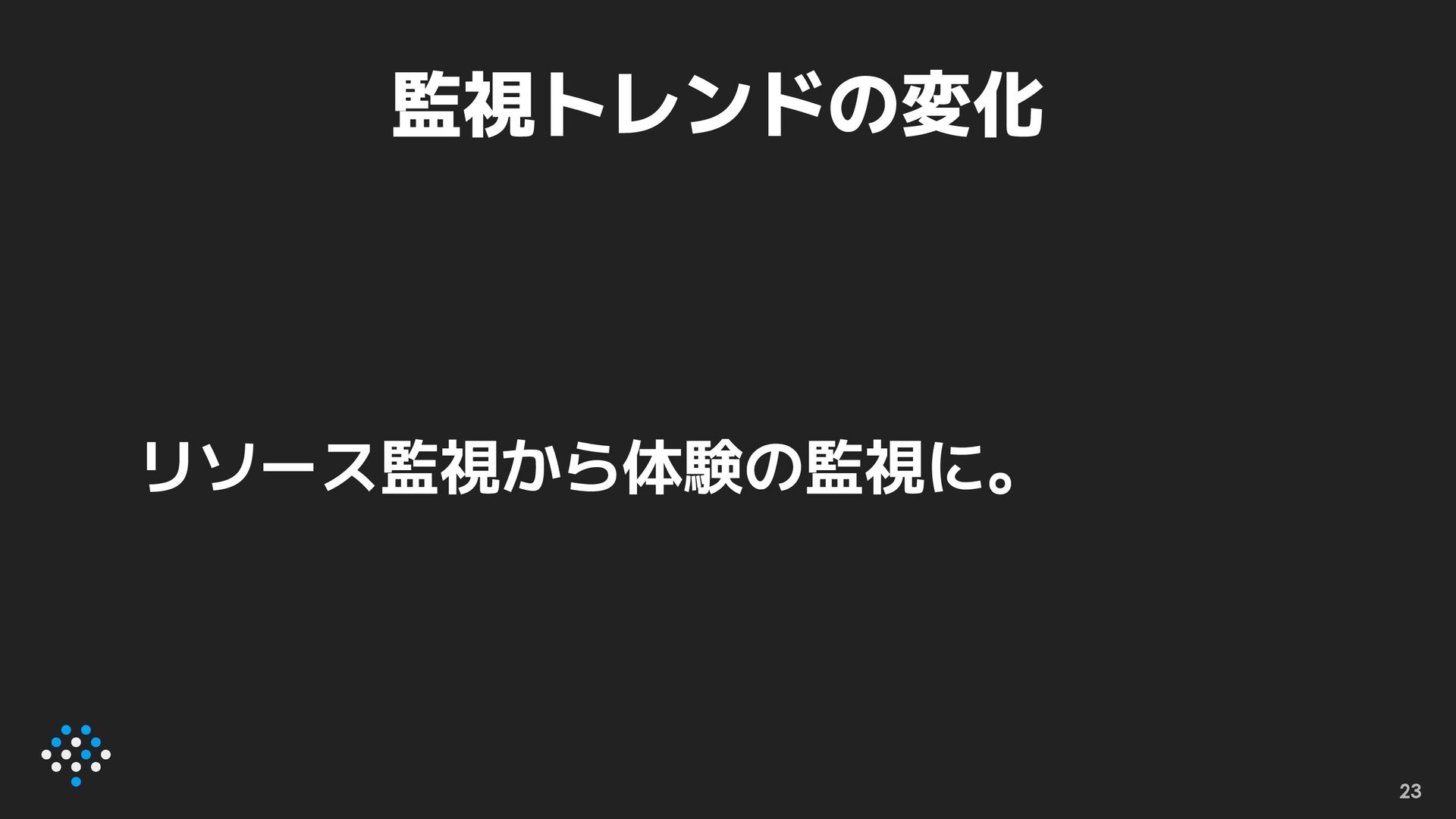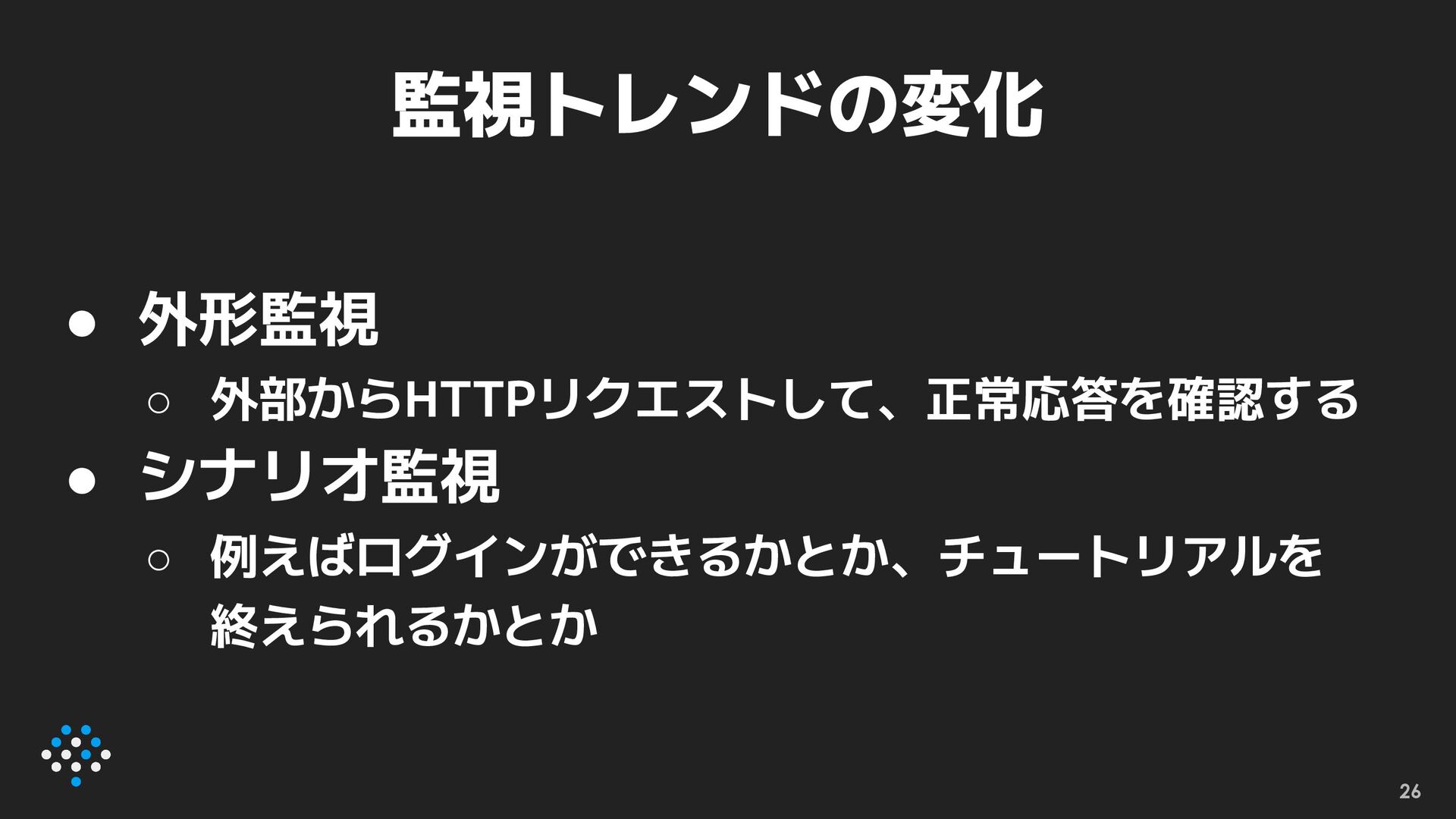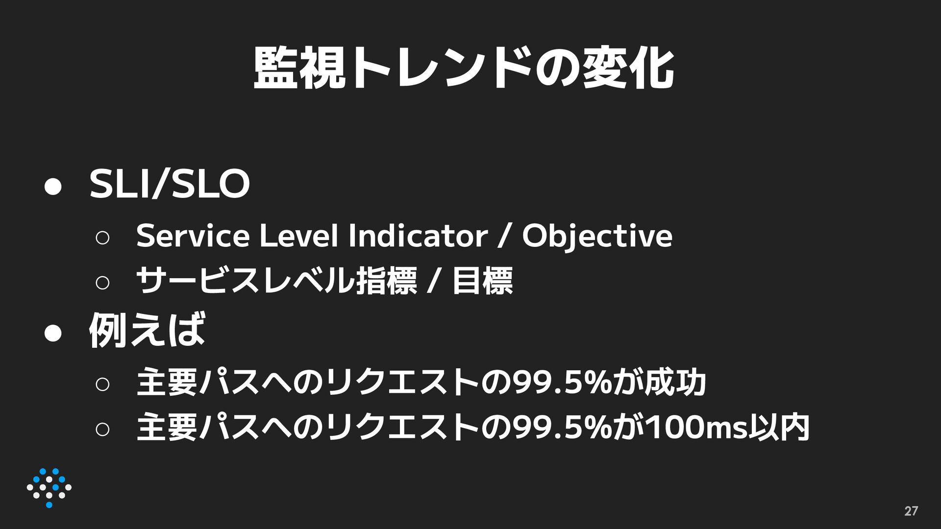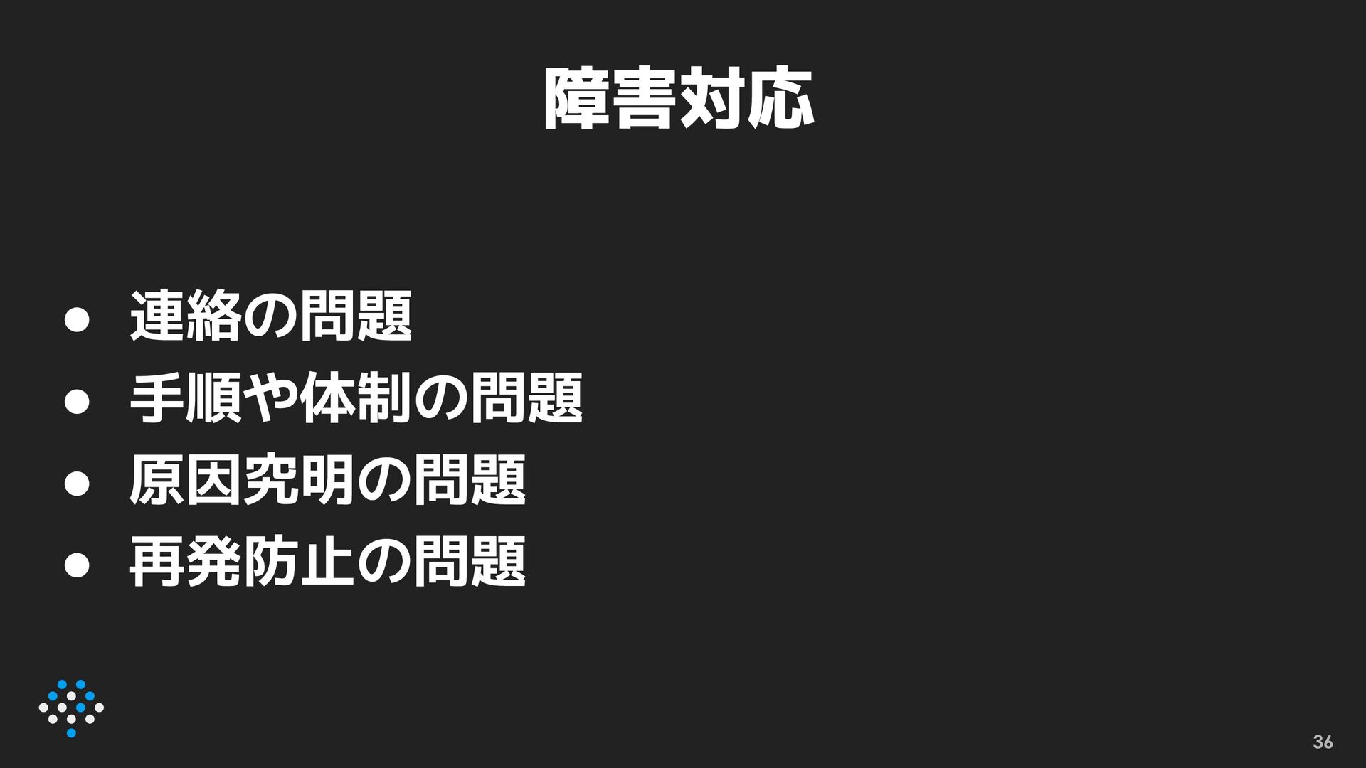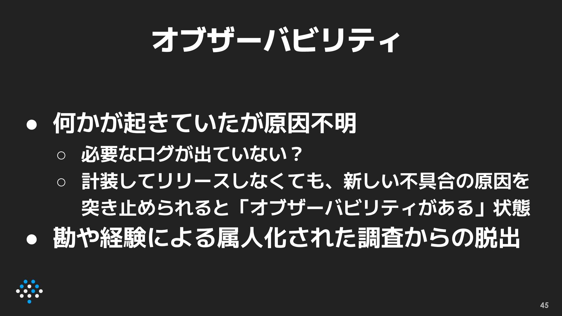 オブザーバビリティ • 何かが起きていたが原因不明 ◦ 必要なログが出ていない? ◦ 計装してリリースしなくても、新しい不具合の原因を 突き止められると「オブザーバビリティがある」状態 • 勘や経験による属人化された調査からの脱出
