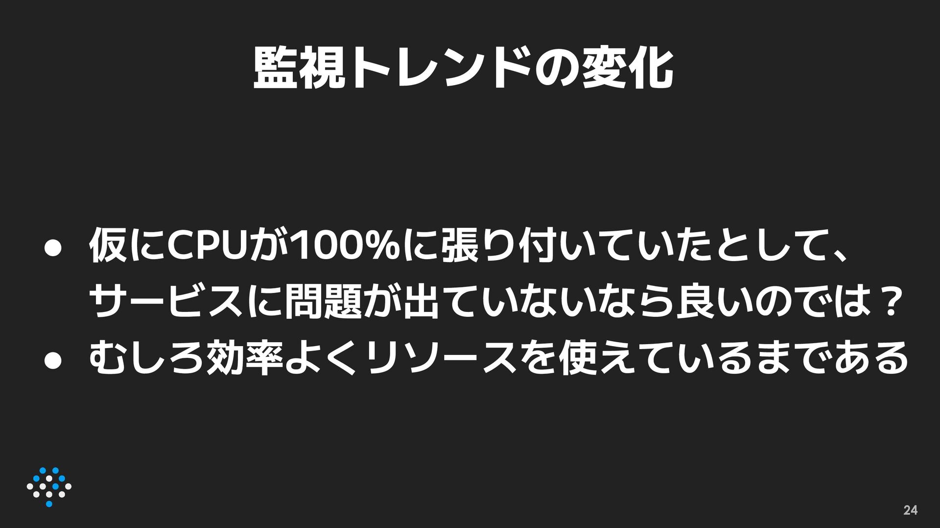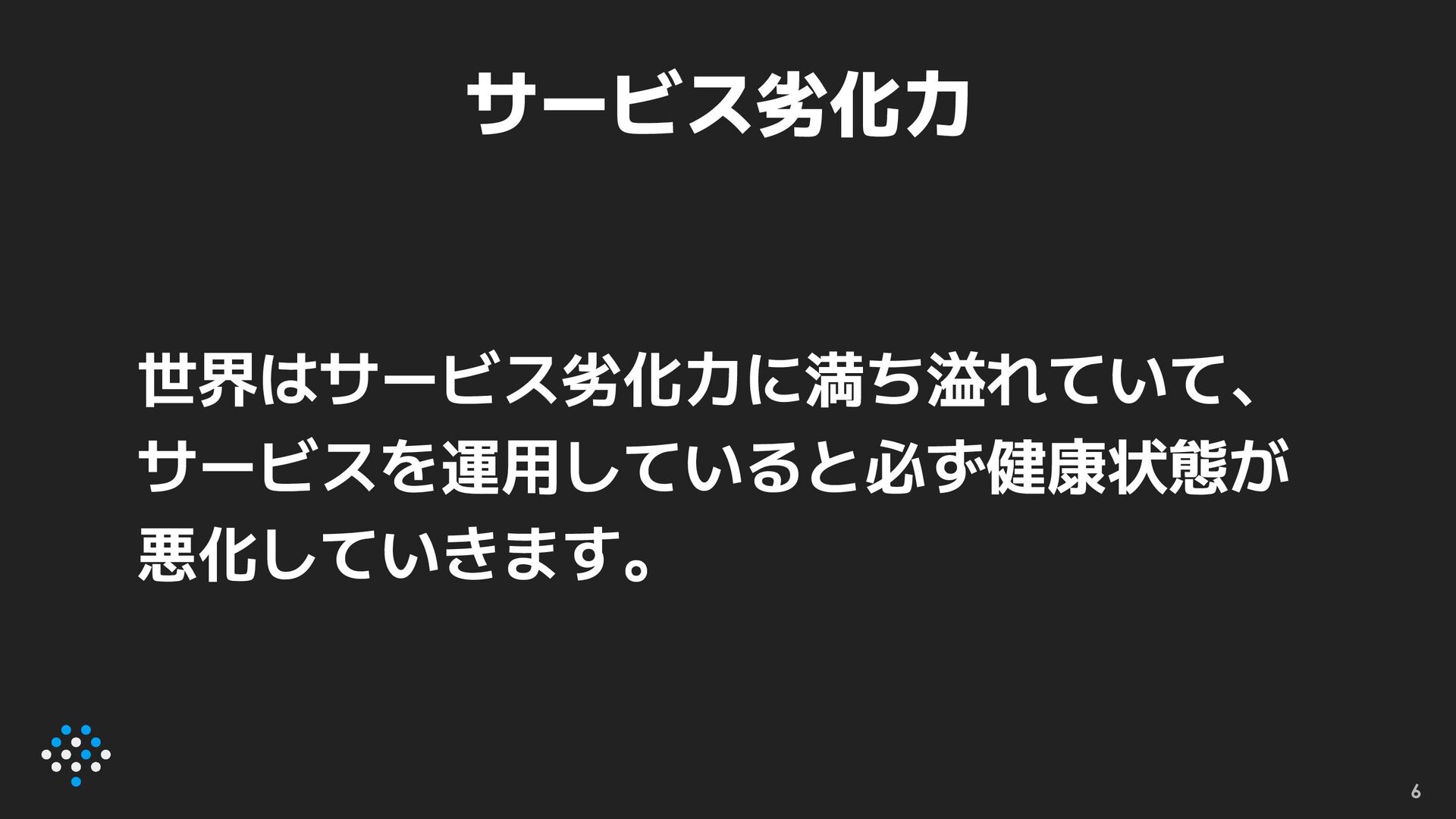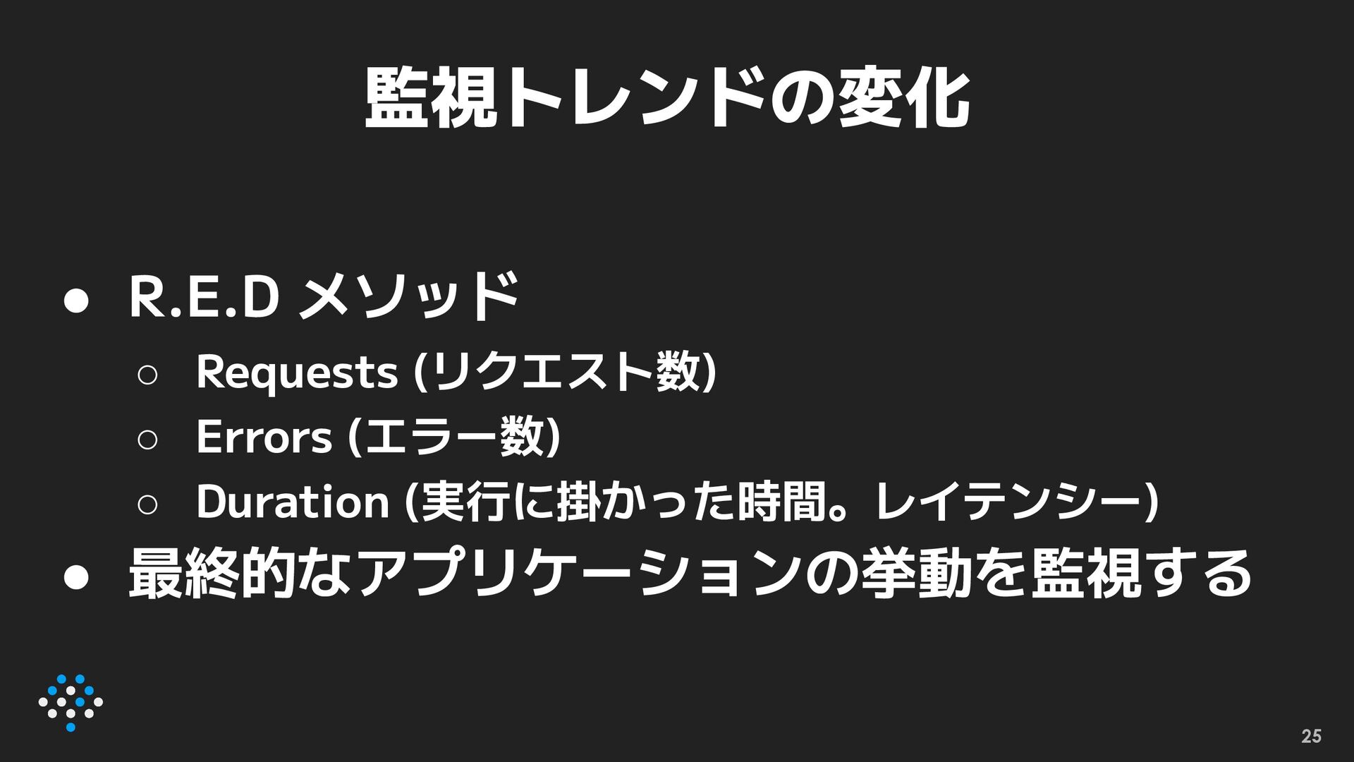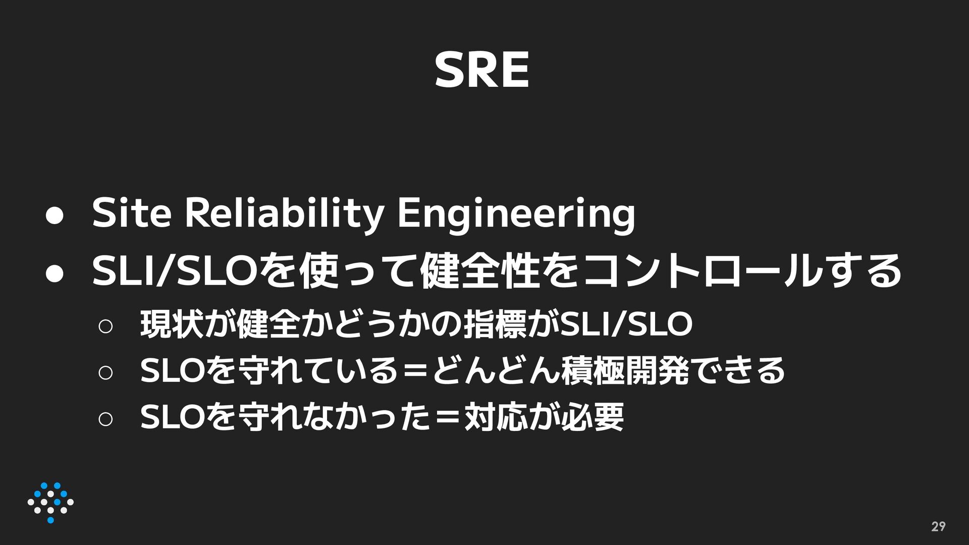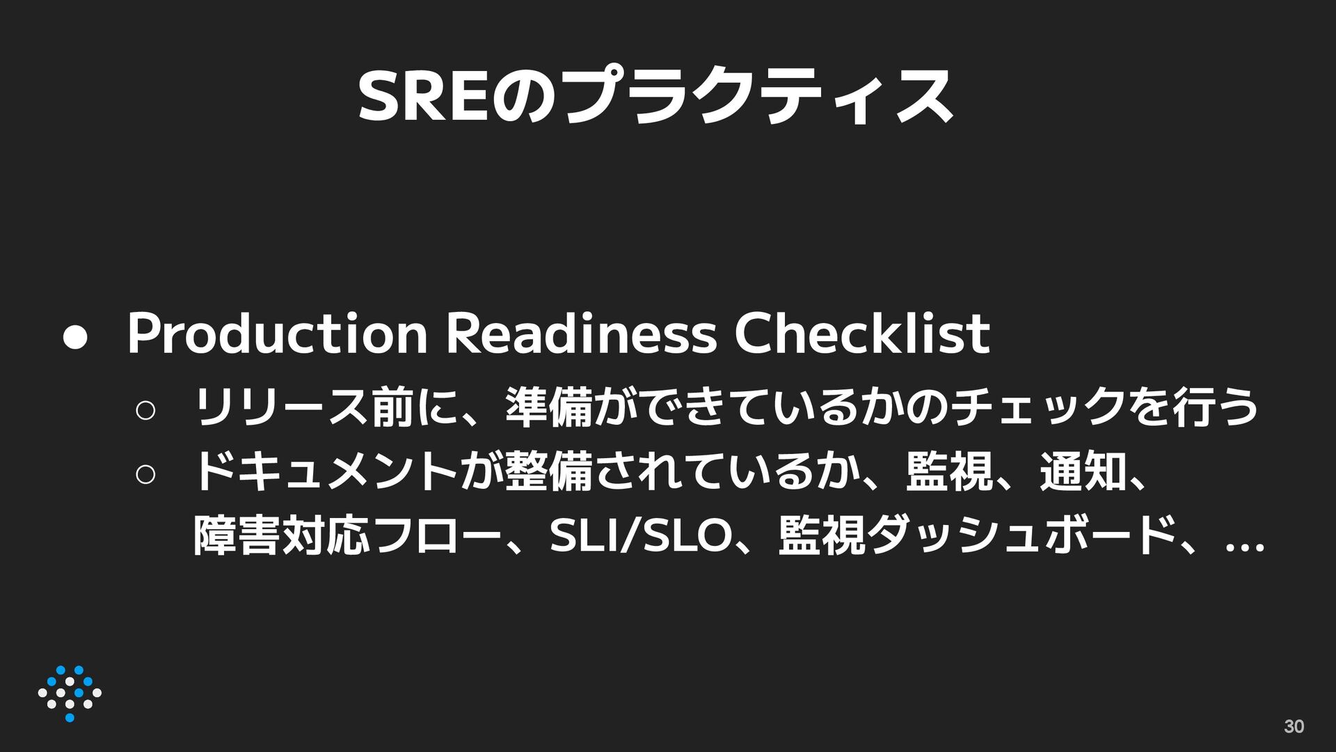 オブザーバビリティ • 何かが起きていたが原因不明 ◦ 必要なログが出ていない? ◦ 計装してリリースしなくても、新しい不具合の原因を 突き止められると「オブザーバビリティがある」状態 • 勘や経験による属人化された調査からの脱出
