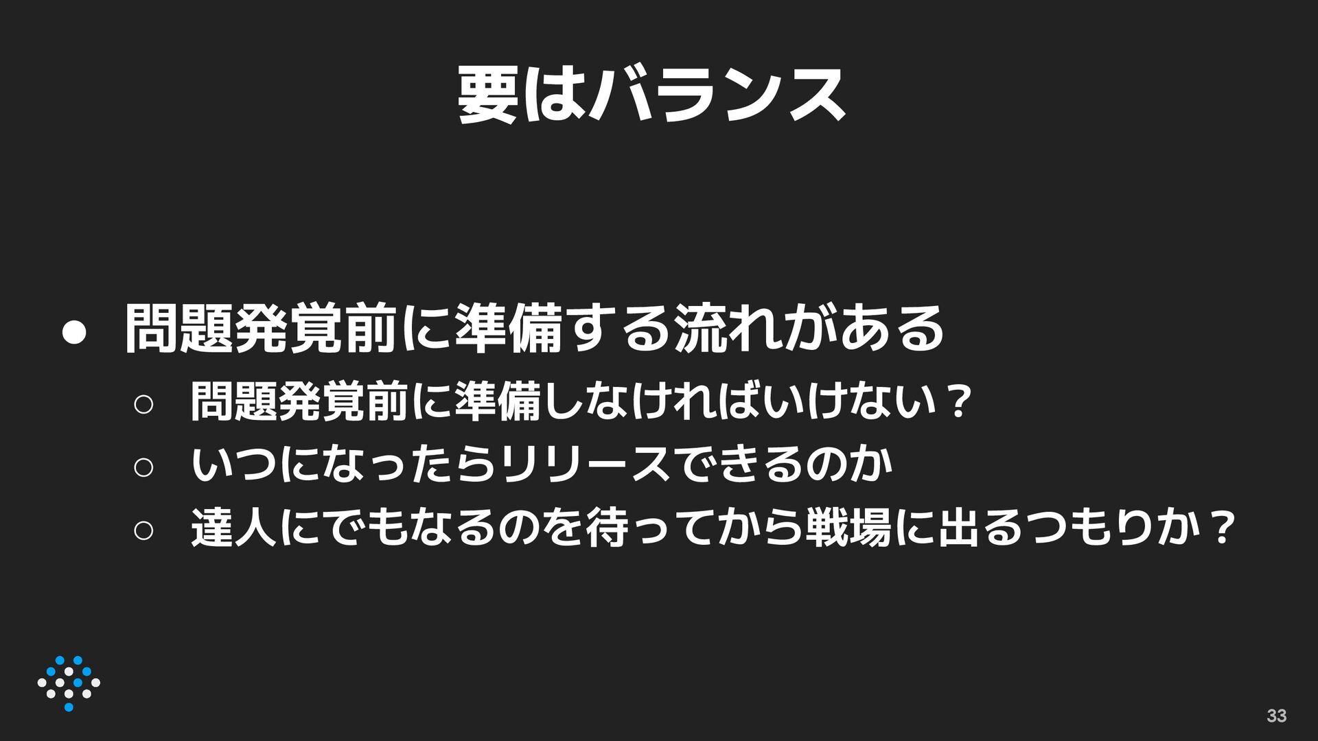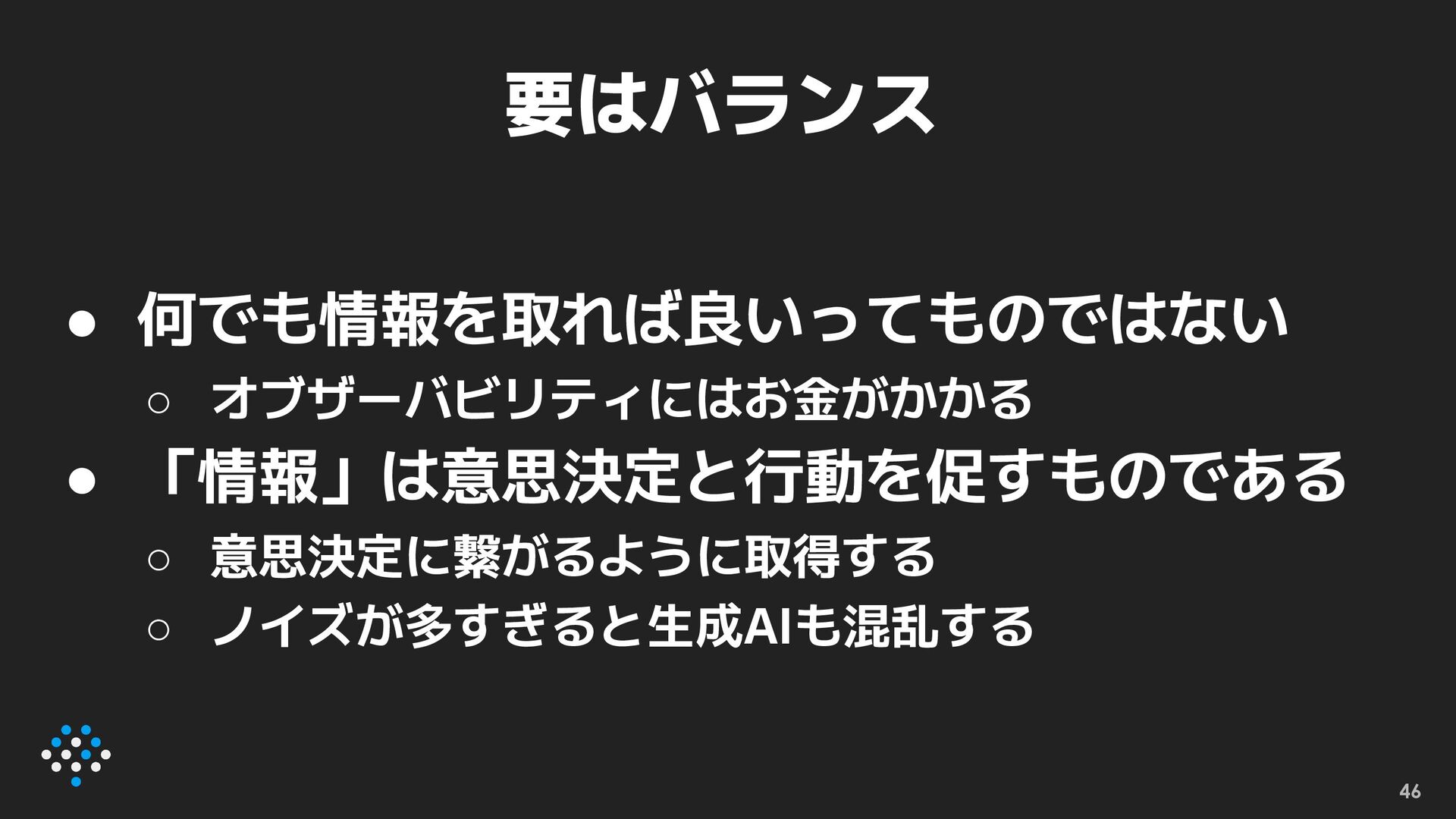 要はバランス • 何でも情報を取れば良いってものではない ◦ オブザーバビリティにはお金がかかる • 「情報」は意思決定と行動を促すものである ◦ 意思決定に繋がるように取得する ◦