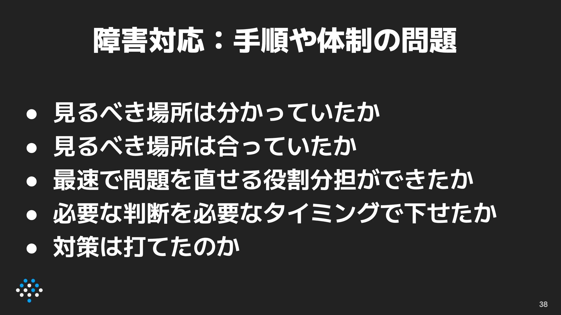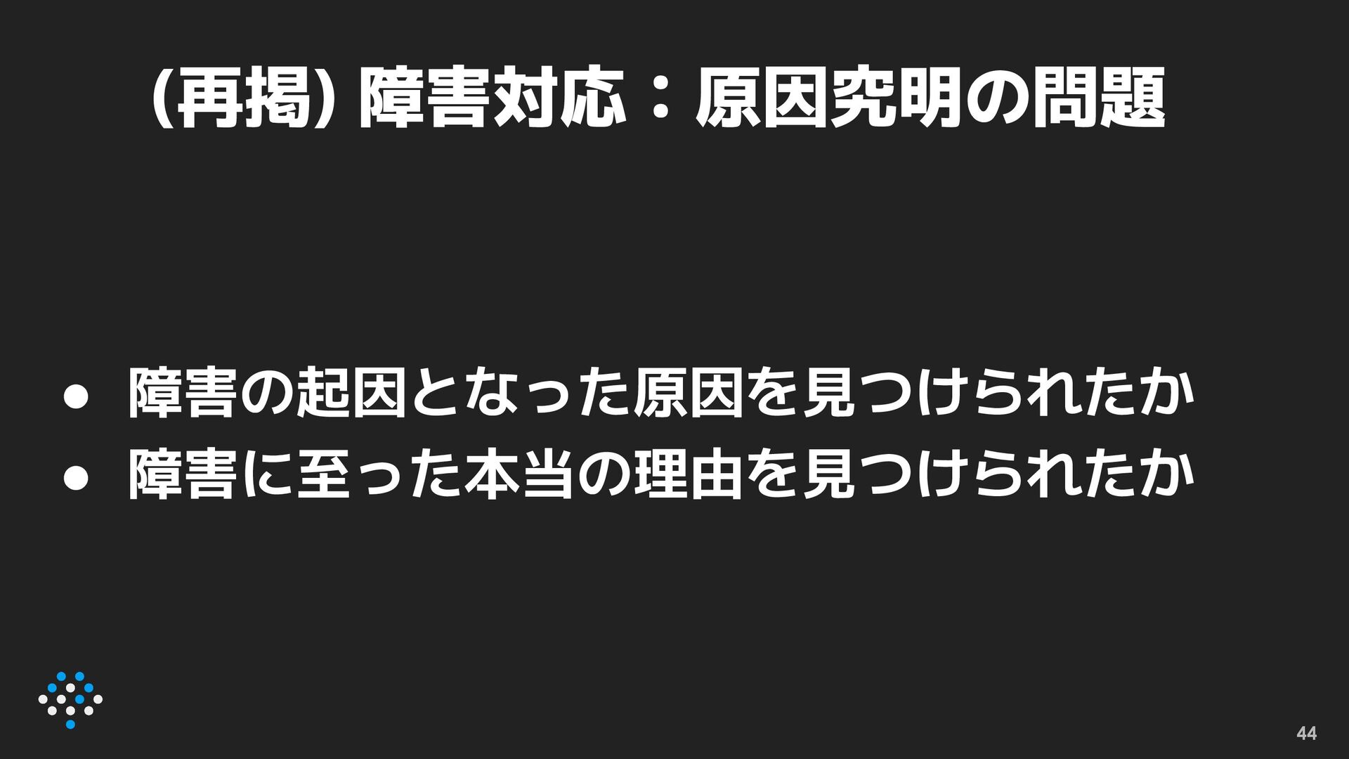(再掲) 障害対応:原因究明の問題 • 障害の起因となった原因を見つけられたか • 障害に至った本当の理由を見つけられたか 44