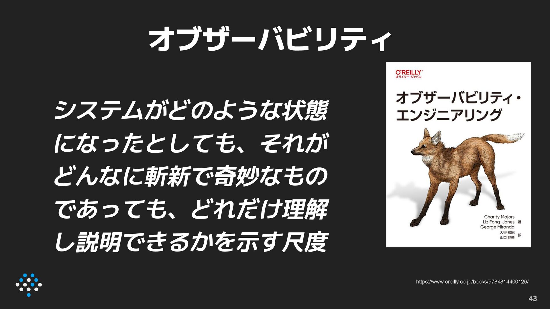 オブザーバビリティ 43 https://www.oreilly.co.jp/books/9784814400126/ システムがどのような状態 になったとしても、それが どんなに斬新で奇妙なもの であっても、どれだけ理解 し説明できるかを示す尺度