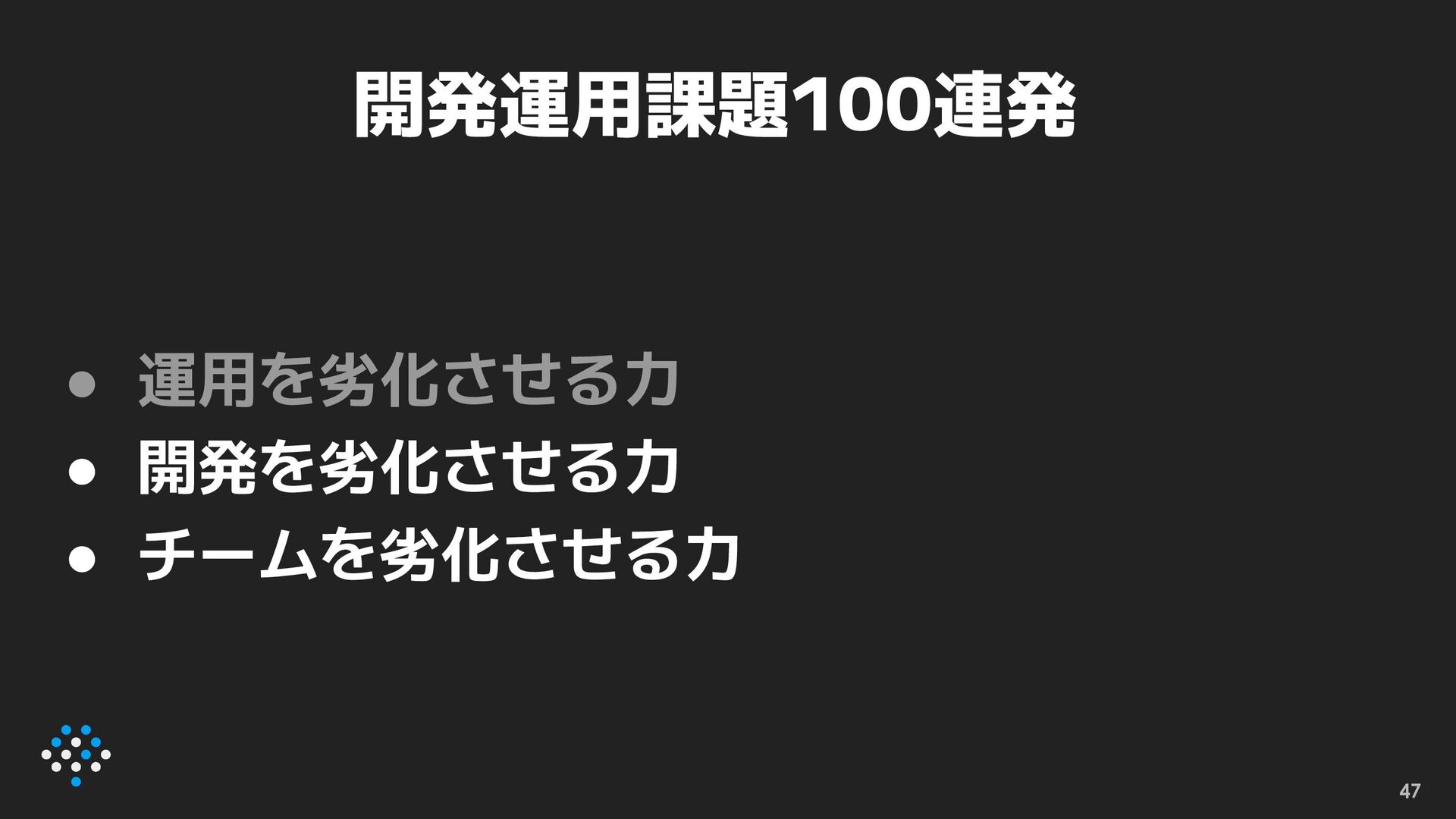 開発運用課題100連発 • 運用を劣化させる力 • 開発を劣化させる力 • チームを劣化させる力 47