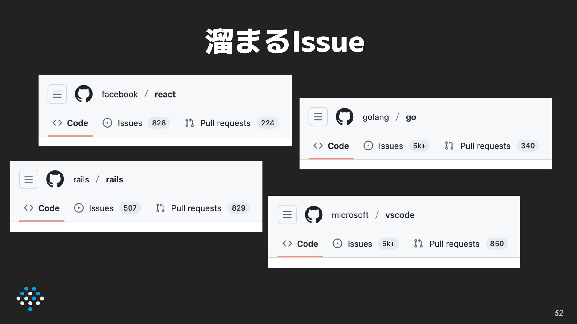 溜まるIssue • 普通に生活をしているだけでチケットは溜 まっていく • 1000 issue超えることもよくある 51