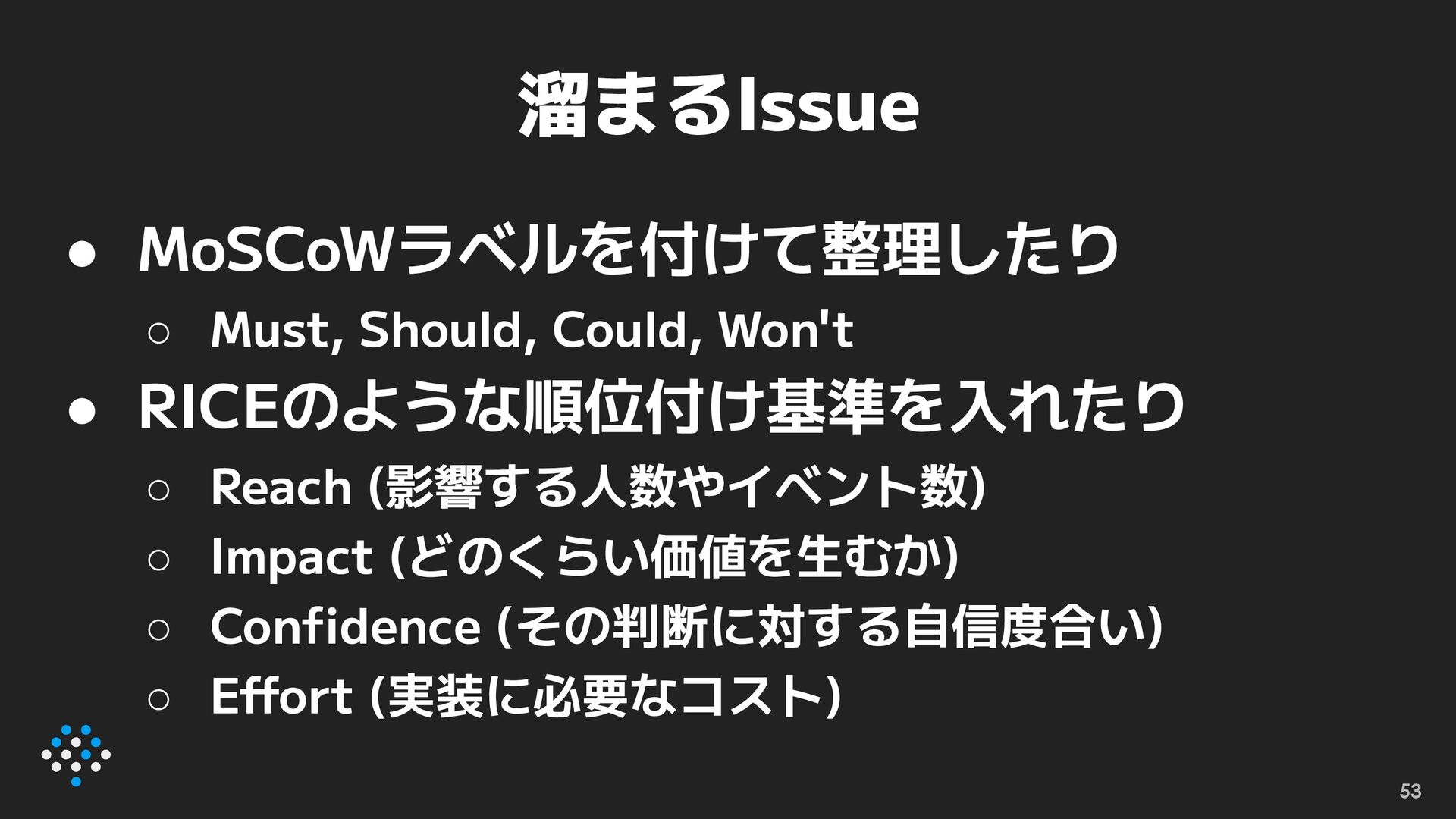 溜まるIssue • MoSCoWラベルを付けて整理したり ◦ Must, Should, Could, Won't • RICEのような順位付け基準を入れたり