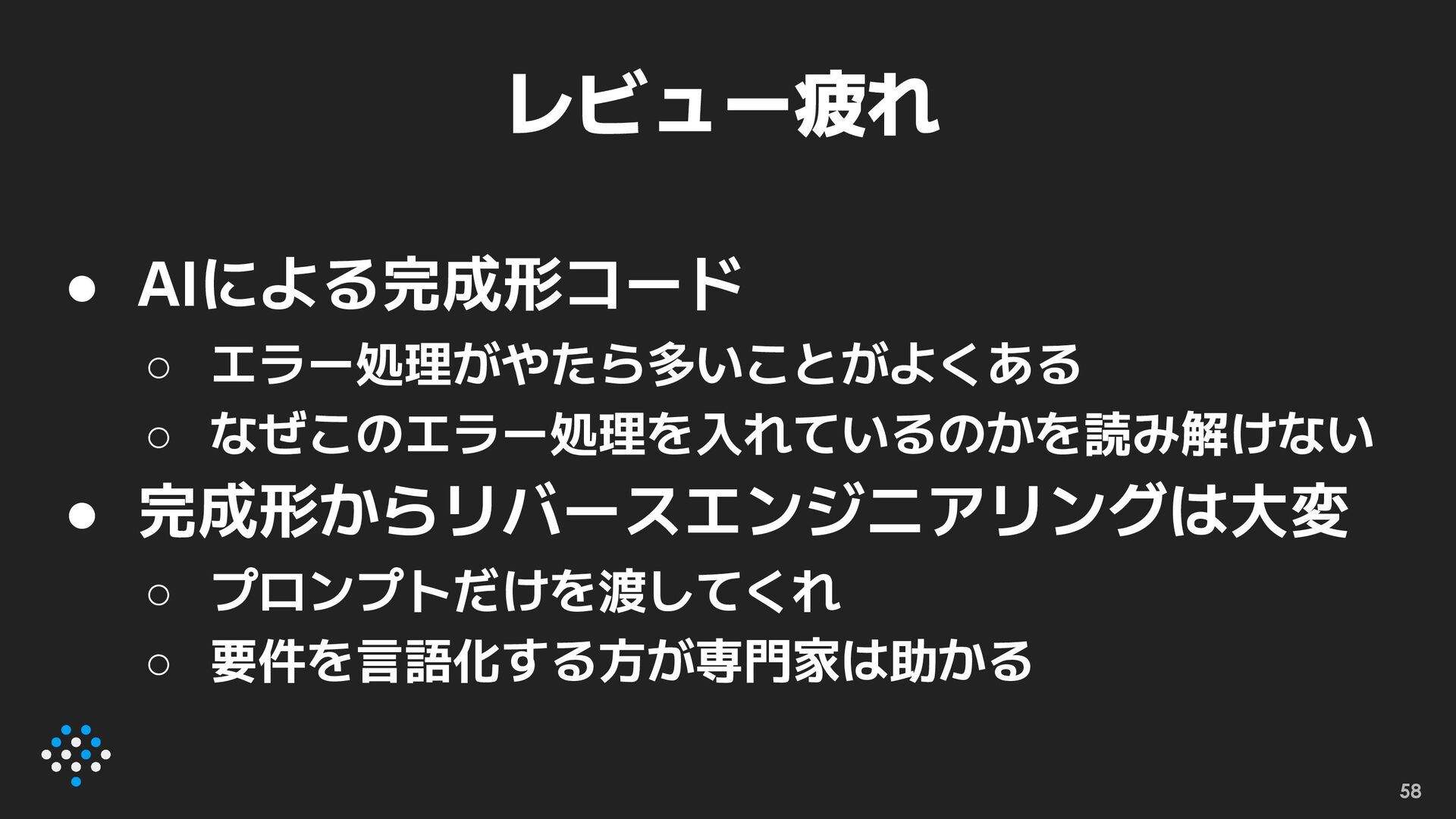レビュー疲れ • AIによる完成形コード ◦ エラー処理がやたら多いことがよくある ◦ なぜこのエラー処理を入れているのかを読み解けない • 完成形からリバースエンジニアリングは大変 ◦