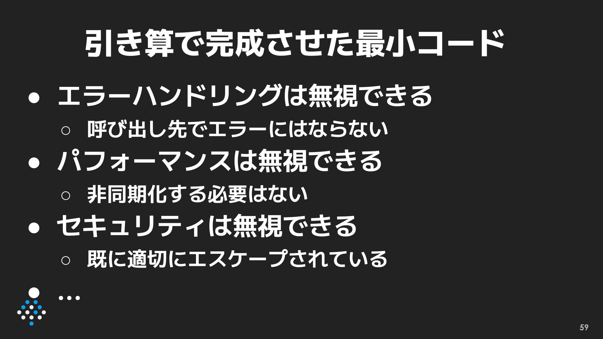 引き算で完成させた最小コード • エラーハンドリングは無視できる ◦ 呼び出し先でエラーにはならない • パフォーマンスは無視できる ◦ 非同期化する必要はない •