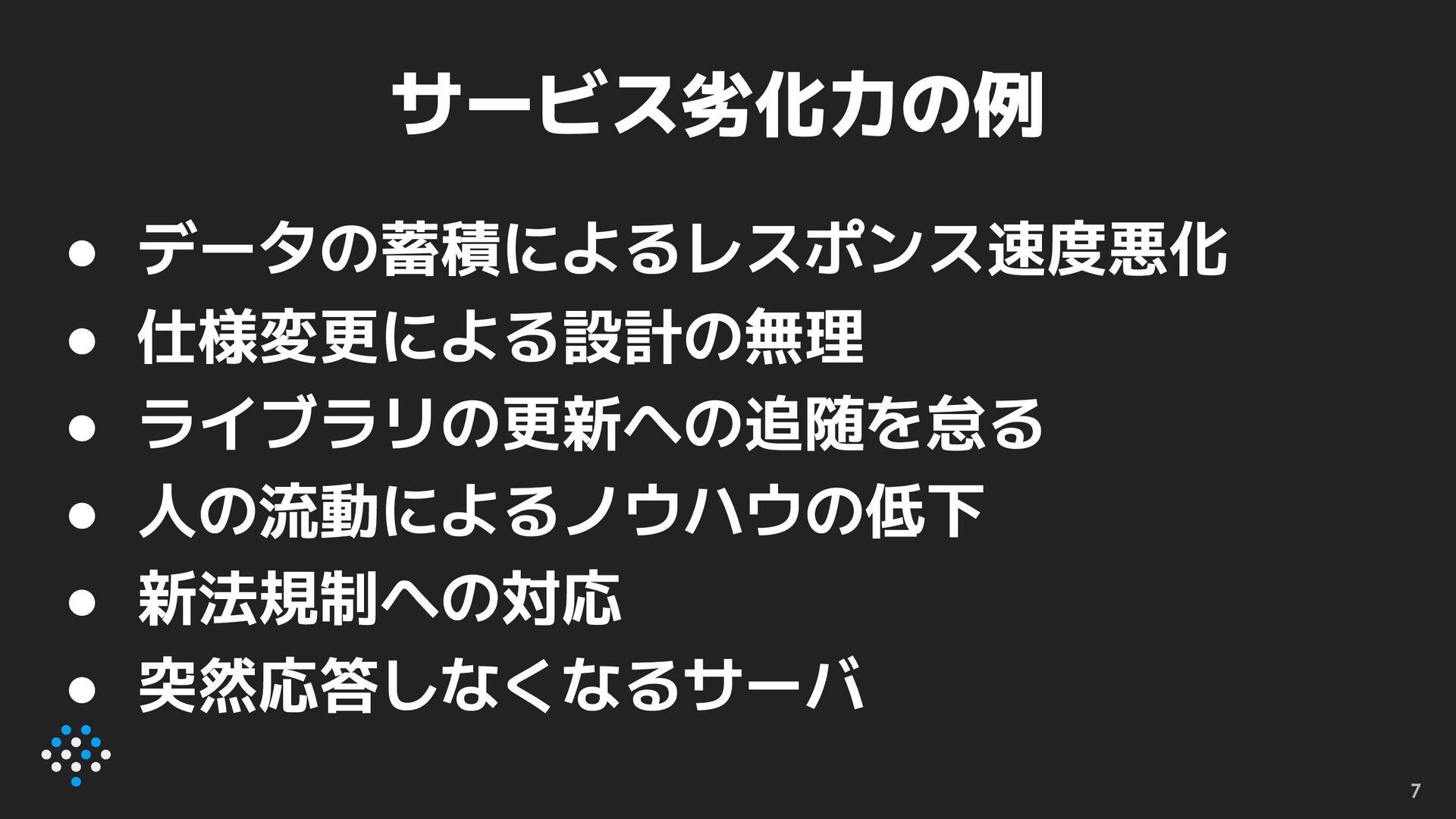 開発を劣化させる力 • 仕様変更で設計が歪む • ドキュメントとの差異が拡大 • デッドコードを消せていない • ライブラリの更新 •