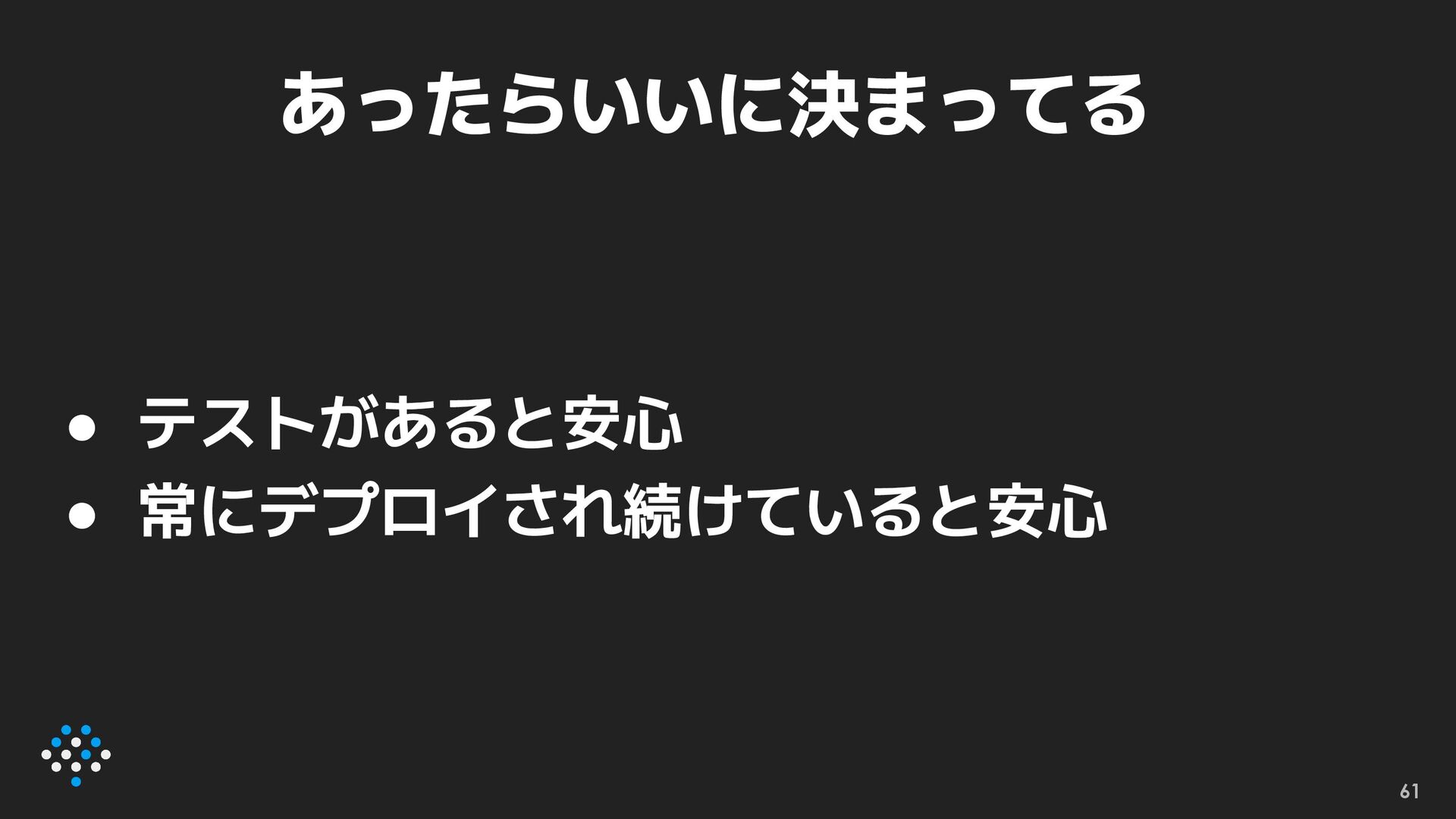 あったらいいに決まってる • テストがあると安心 • 常にデプロイされ続けていると安心 61