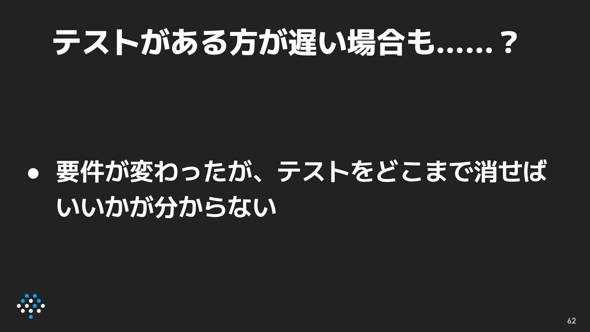 テストがある方が遅い場合も……? • 要件が変わったが、テストをどこまで消せば いいかが分からない 62