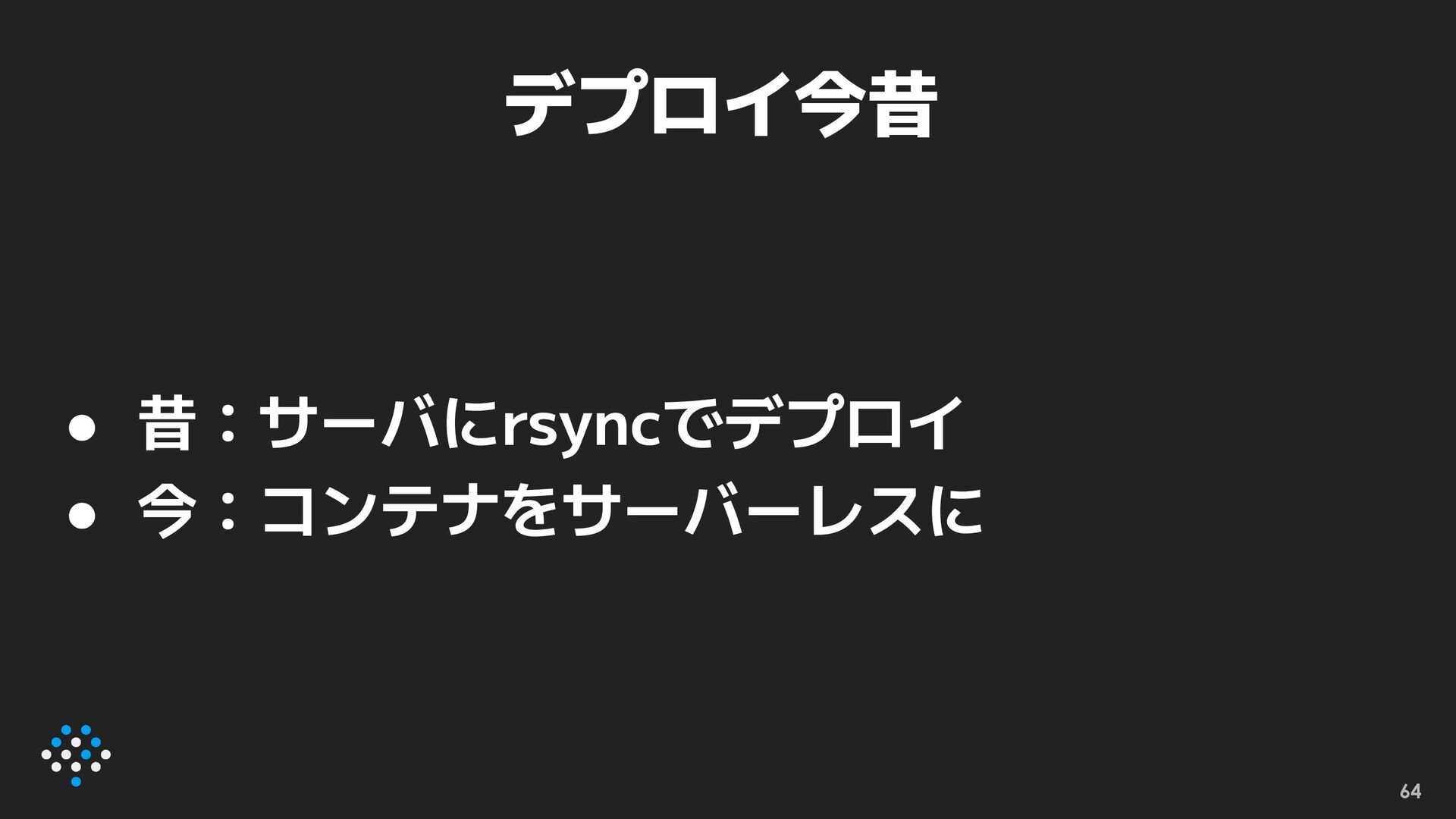 デプロイ今昔 • 昔:サーバにrsyncでデプロイ • 今:コンテナをサーバーレスに 64
