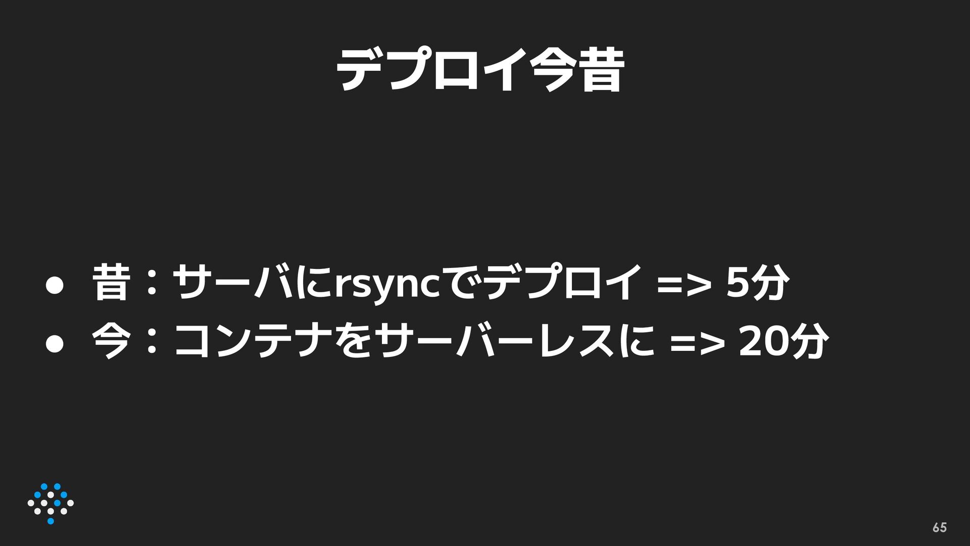 デプロイ今昔 • 昔:サーバにrsyncでデプロイ => 5分 • 今:コンテナをサーバーレスに => 20分 65
