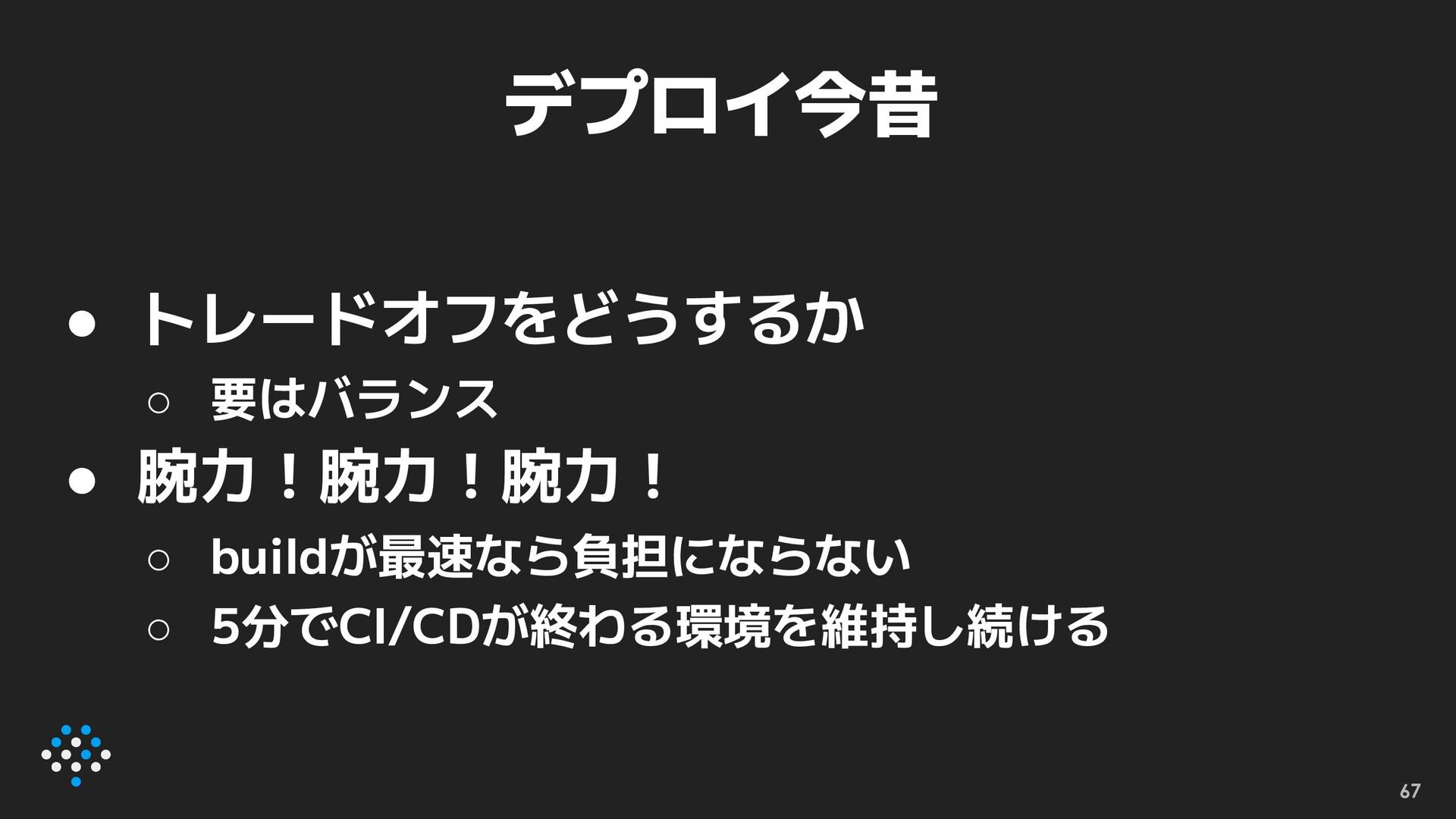 デプロイ今昔 • トレードオフをどうするか ◦ 要はバランス • 腕力!腕力!腕力! ◦ buildが最速なら負担にならない ◦