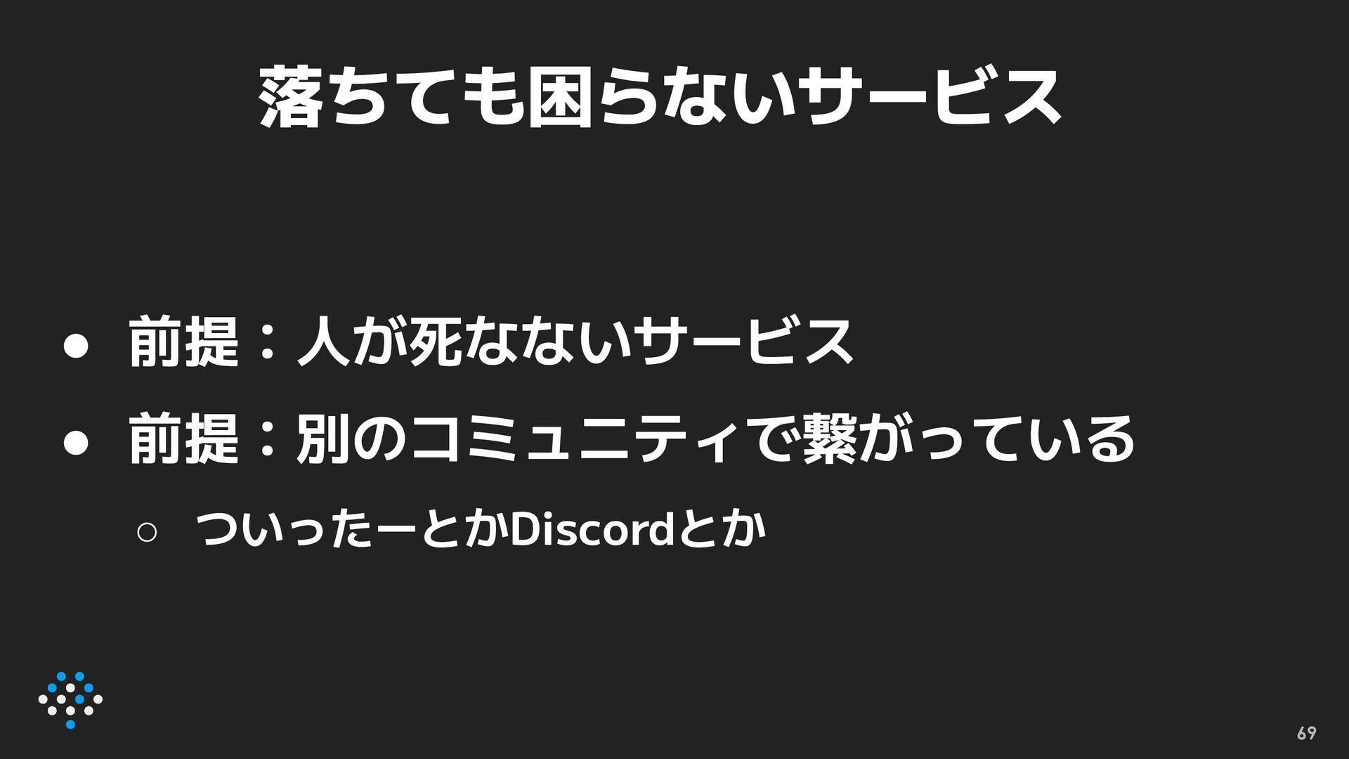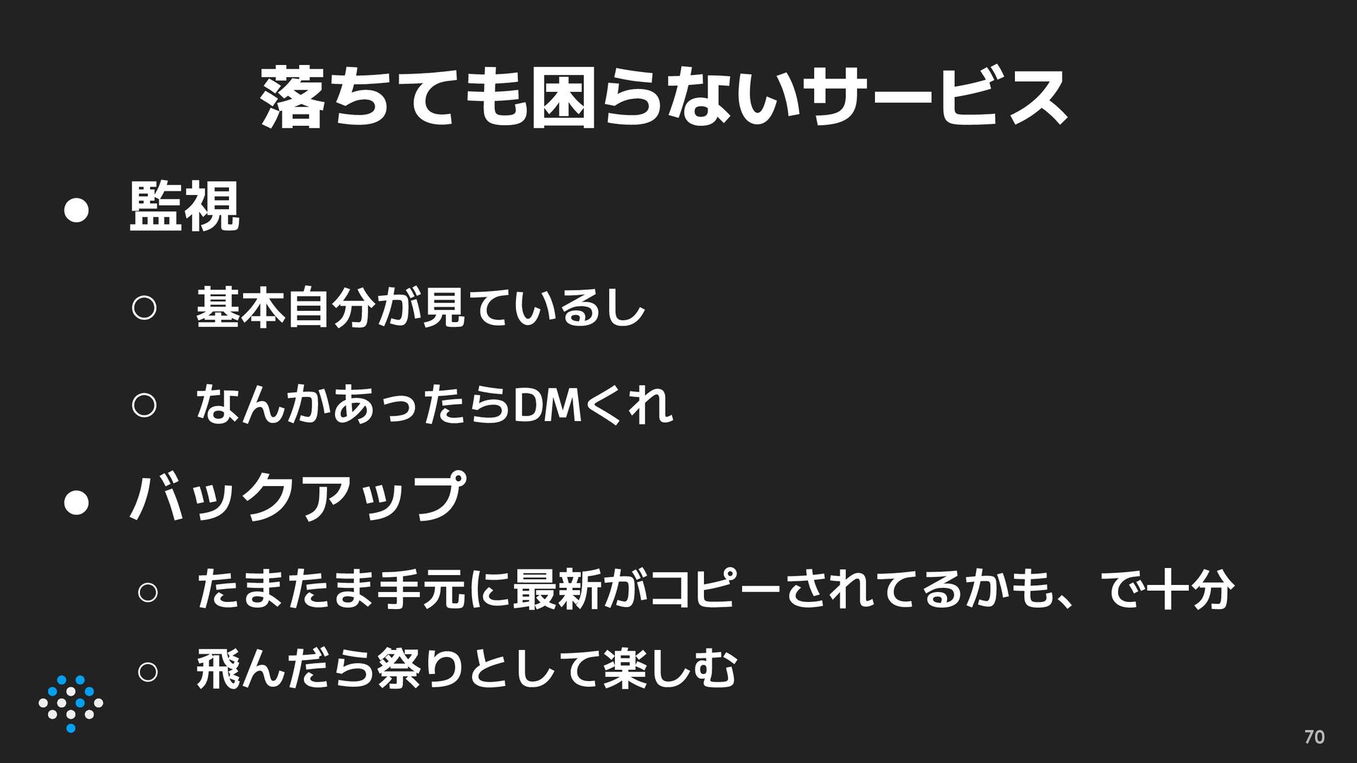 落ちても困らないサービス • 前提:人が死なないサービス • 前提:別のコミュニティで繋がっている ◦ ついったーとかDiscordとか 69