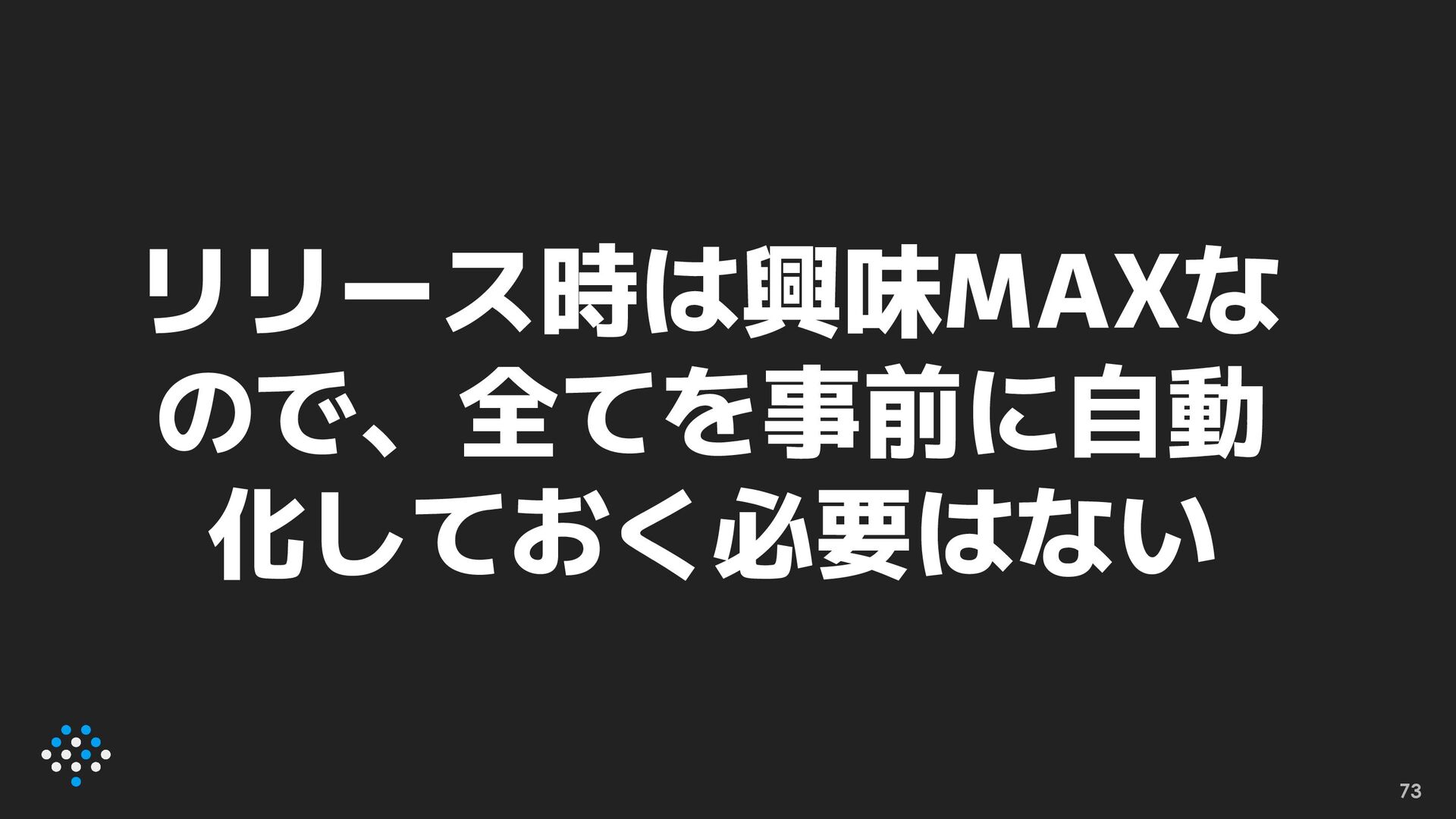 73 リリース時は興味MAXな ので、全てを事前に自動 化しておく必要はない