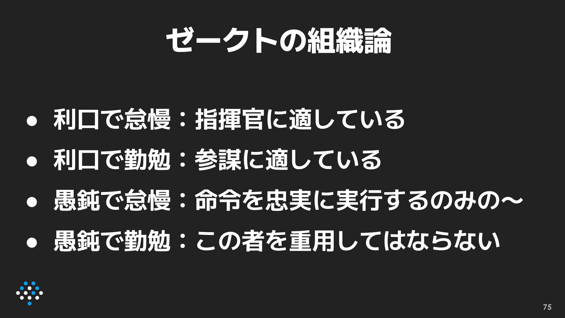 ゼークトの組織論 • 利口で怠慢:指揮官に適している • 利口で勤勉:参謀に適している • 愚鈍で怠慢:命令を忠実に実行するのみの〜 • 愚鈍で勤勉:この者を重用してはならない 75