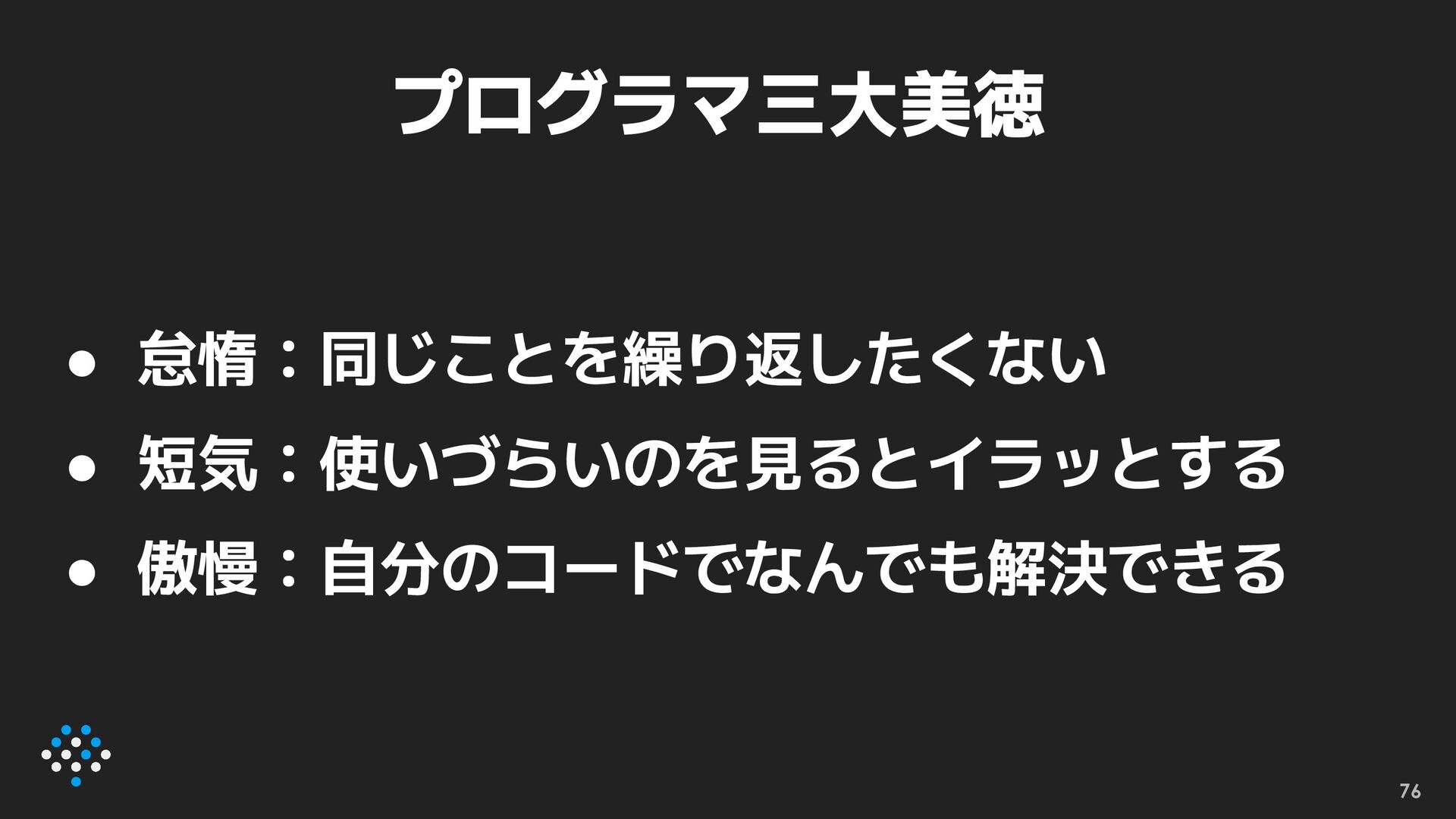 プログラマ三大美徳 • 怠惰:同じことを繰り返したくない • 短気:使いづらいのを見るとイラッとする • 傲慢:自分のコードでなんでも解決できる 76