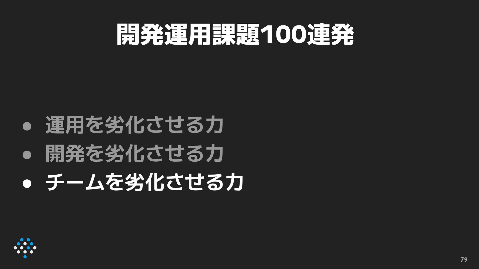 開発運用課題100連発 • 運用を劣化させる力 • 開発を劣化させる力 • チームを劣化させる力 79